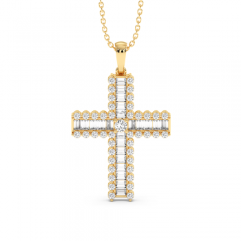 Pandantiv cruciulita din aur de 14 K, cu diamante baget de 0.53ct si diamante rotunde de 0.62ct. Greutatea cruciulitei este de aproximativ 4.80 grame. Accesati "SPECIFICATII" pentru mai multe detalii despre acest produs.