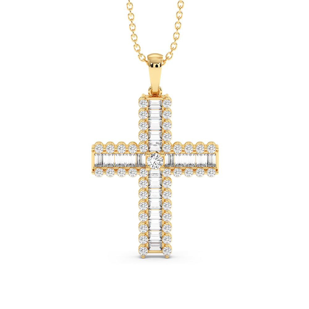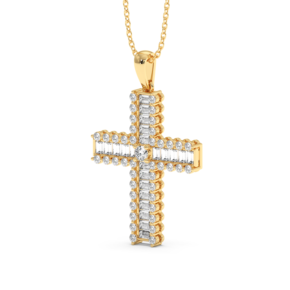 Pandantiv cruciulita din aur de 14 K, cu diamante baget de 0.53ct si diamante rotunde de 0.62ct. Greutatea cruciulitei este de aproximativ 4.80 grame. Accesati "SPECIFICATII" pentru mai multe detalii despre acest produs.