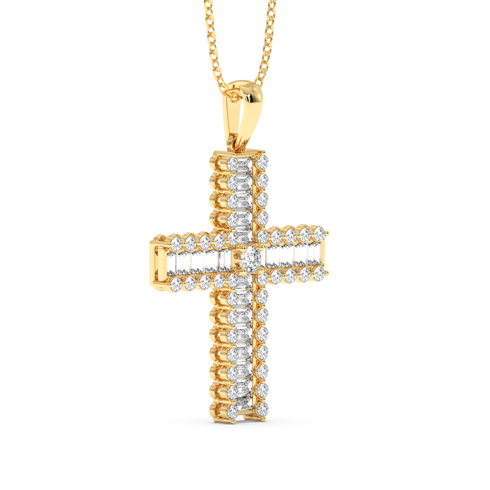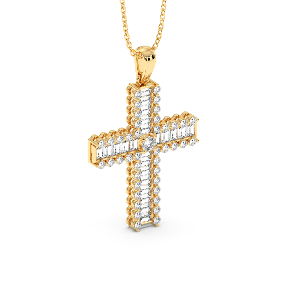 Pandantiv cruciulita din aur de 14 K, cu diamante baget de 0.53ct si diamante rotunde de 0.62ct. Greutatea cruciulitei este de aproximativ 4.80 grame.