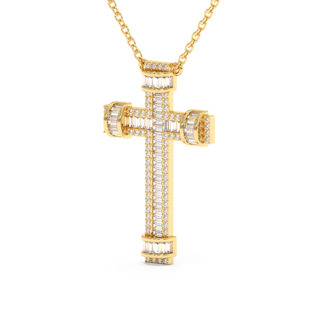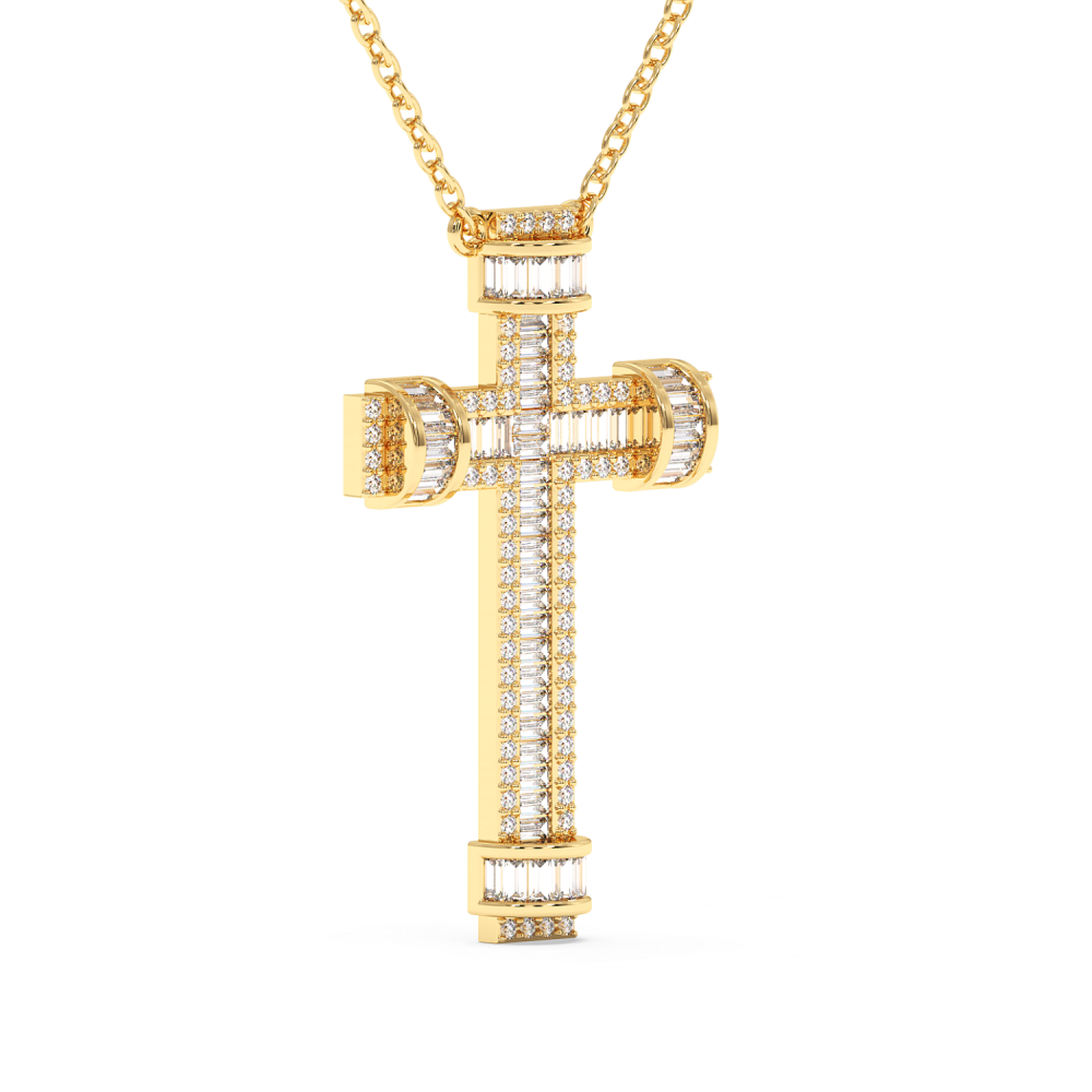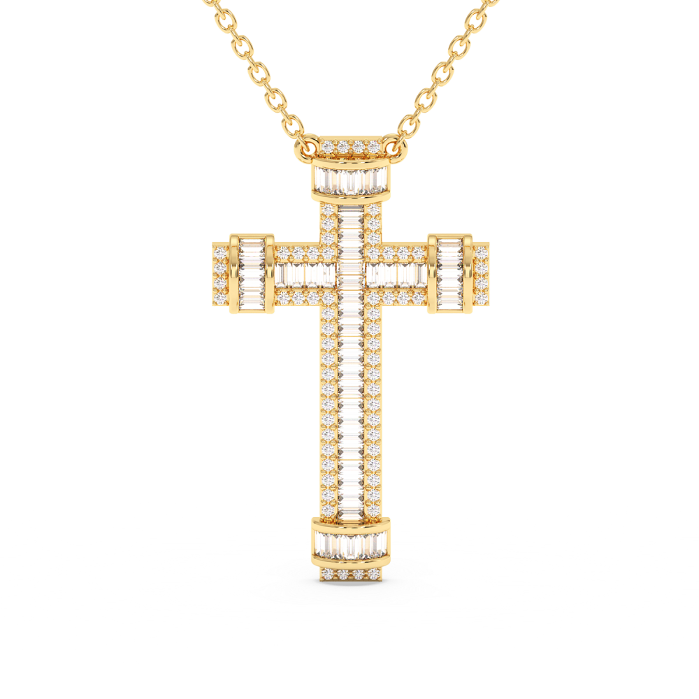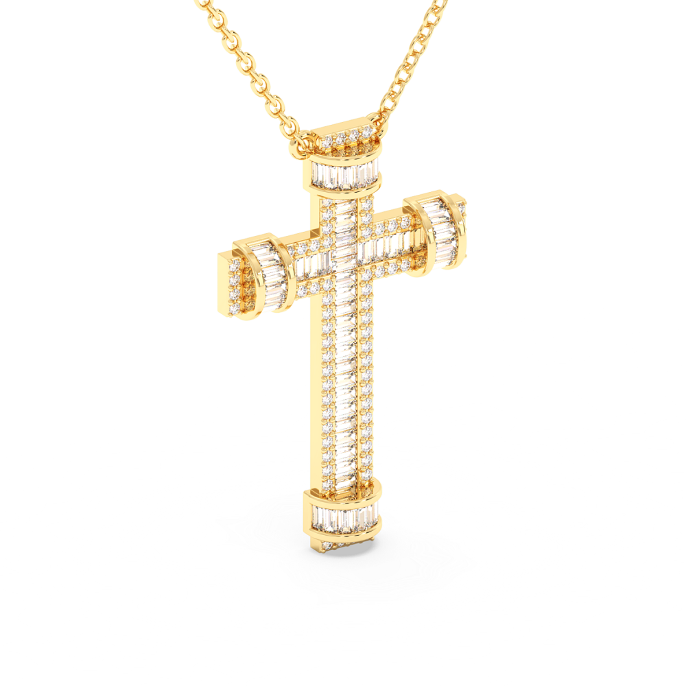 Pandantiv cruciulita din aur de 14 K, cu diamante baget de 1.02ct si diamante rotunde de 0.26ct. Greutatea cruciulitei este de aproximativ 4.20 grame. Accesati  "SPECIFICATII" pentru mai multe detalii despre acest produs.