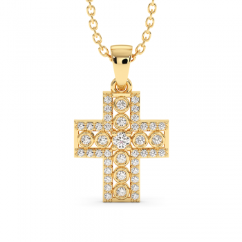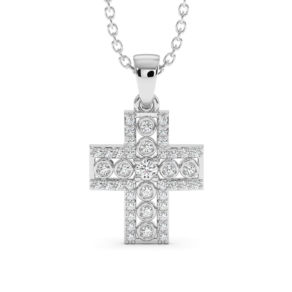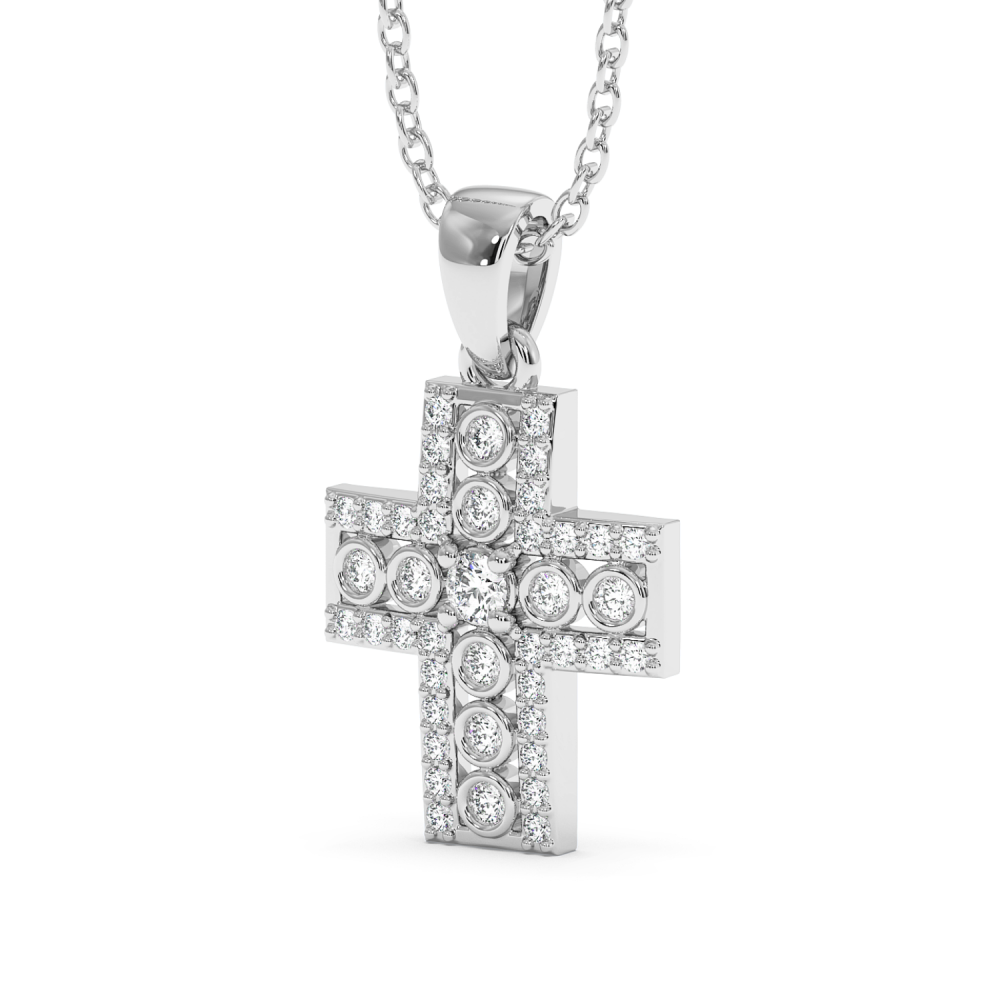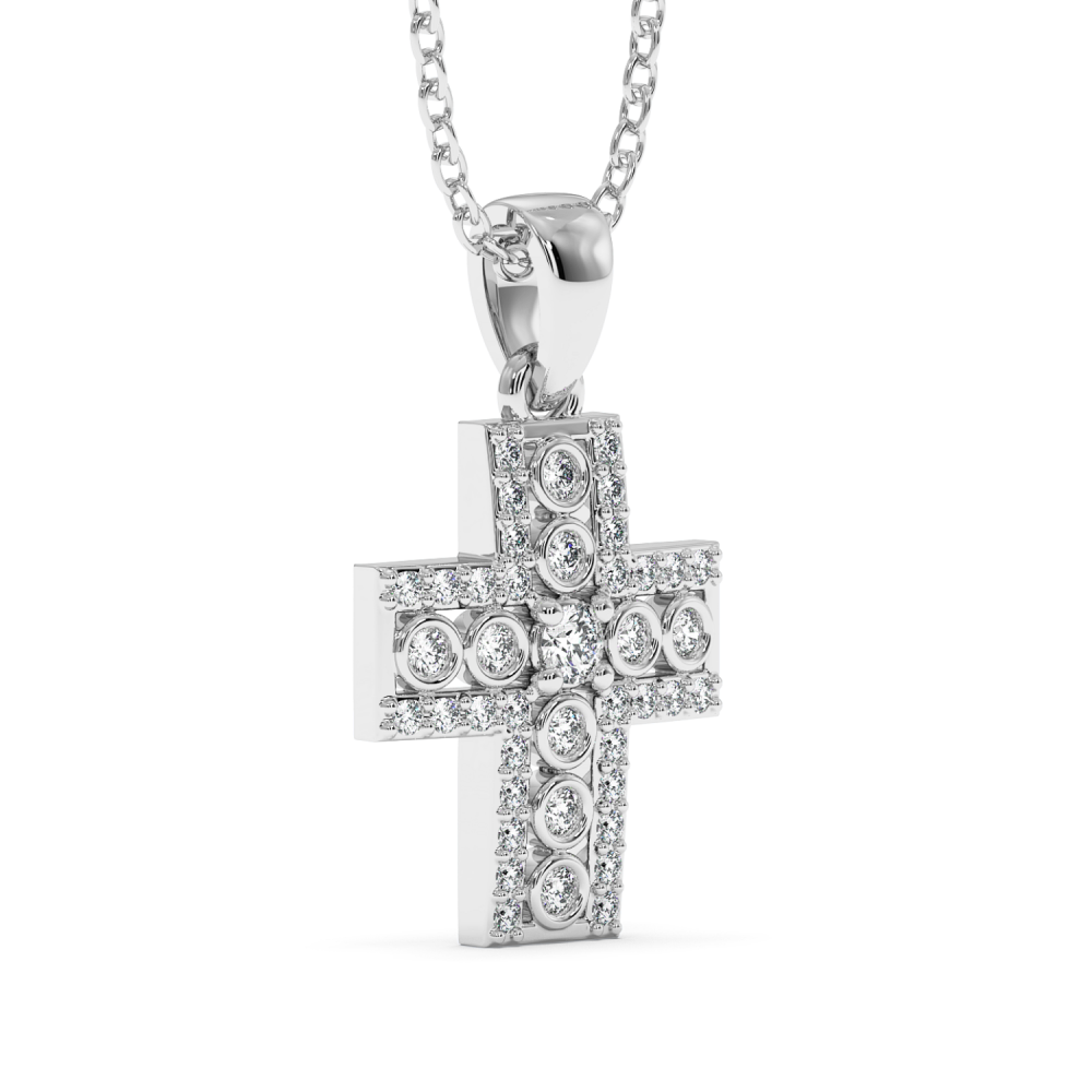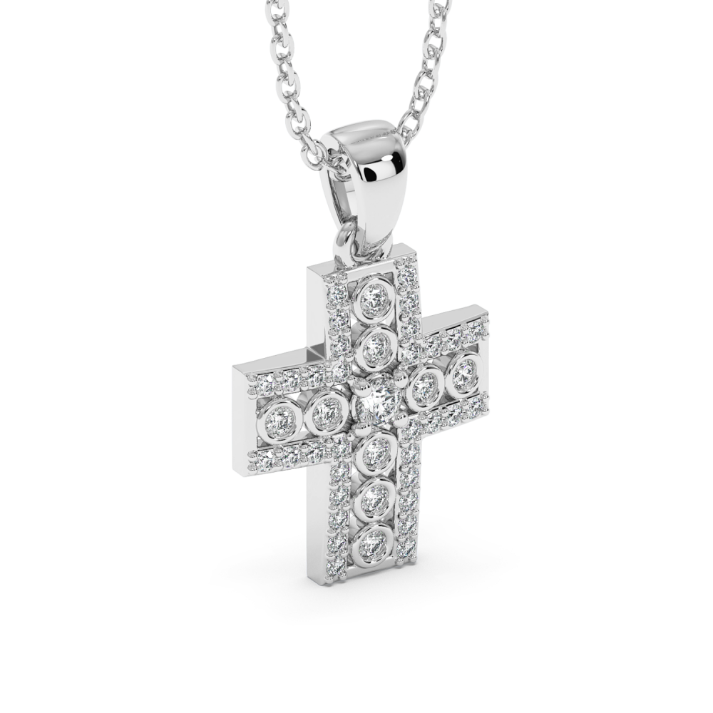 Pandantiv cruciulita din aur alb de 14 K, cu diamante de 0.22 ct. Greutatea cruciulitei este de 2.97 grame.