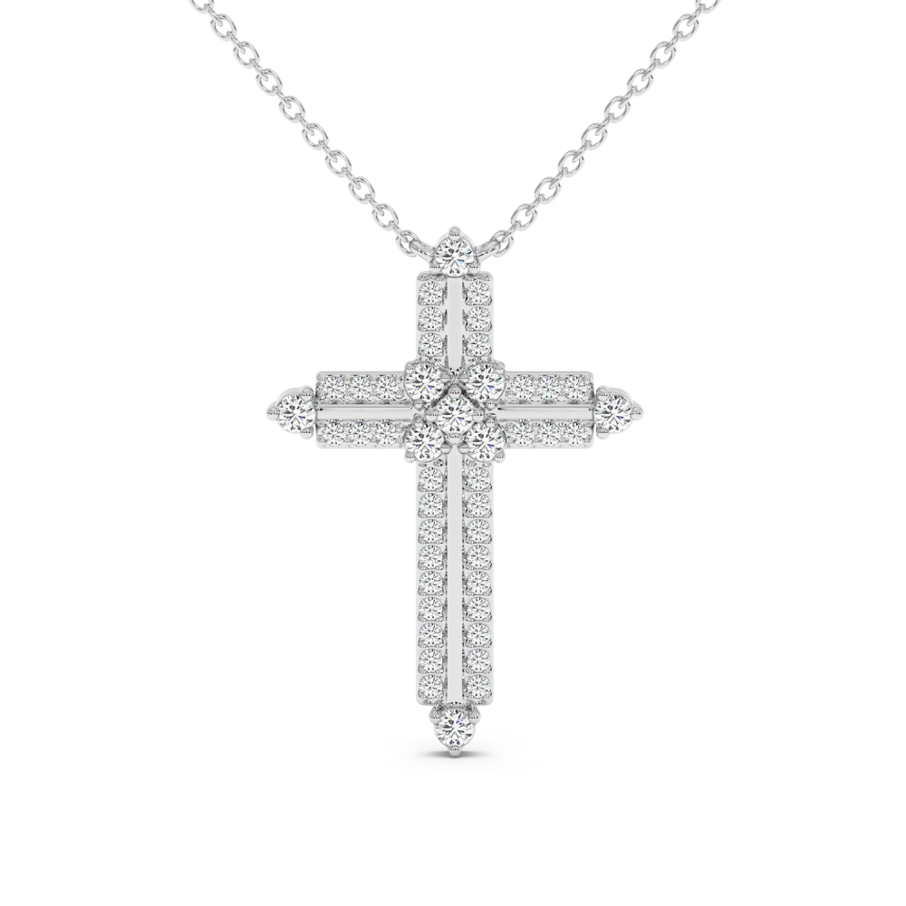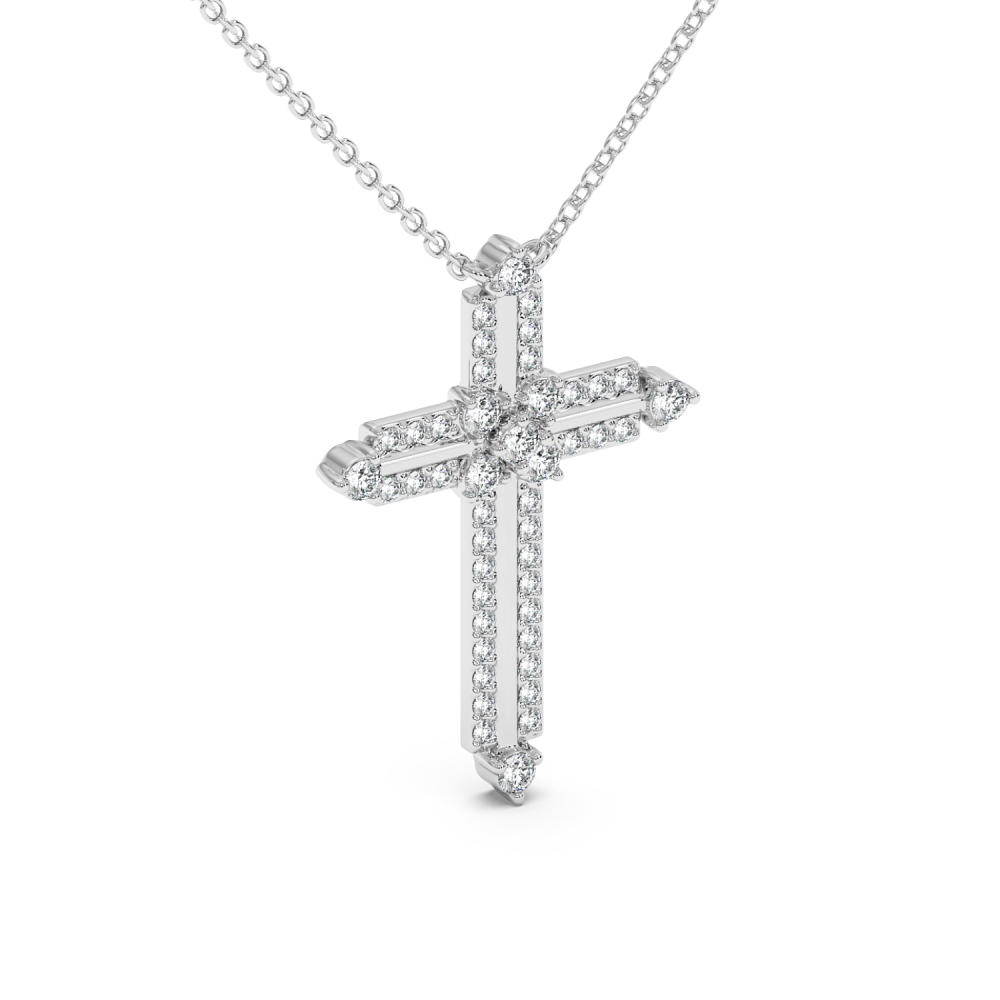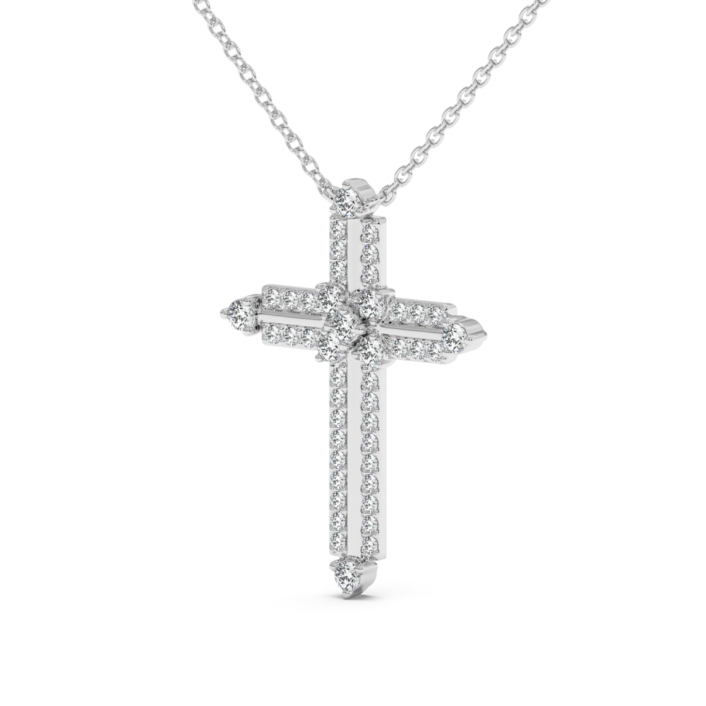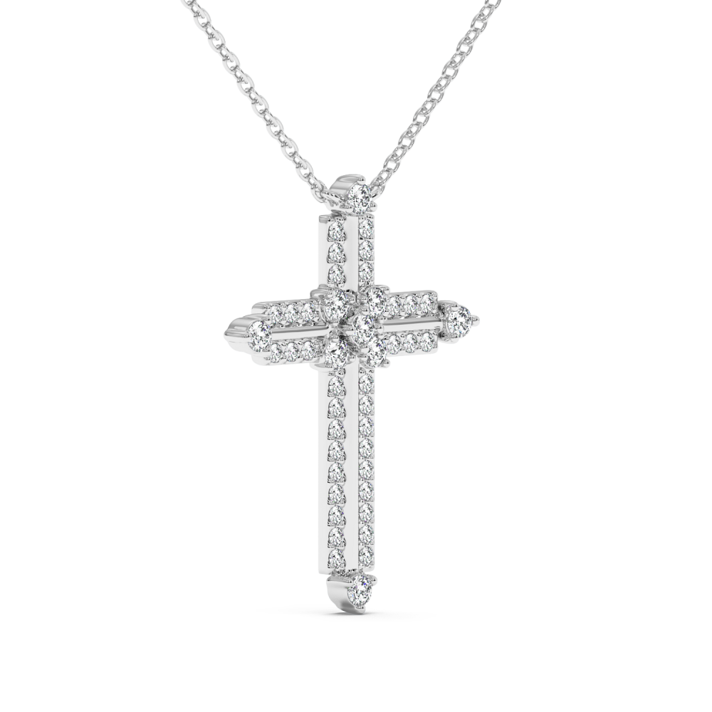 Pandantiv cruciulita din aur alb de 14 K, cu diamante de 0.44 ct. Greutatea cruciulitei este de 3.7 grame.