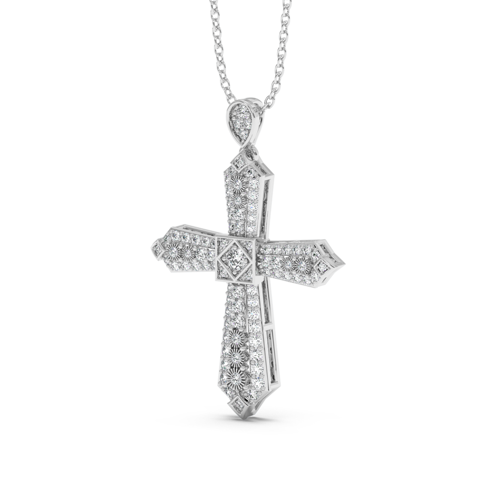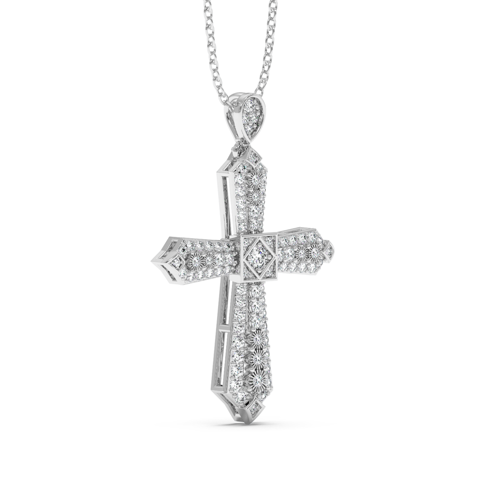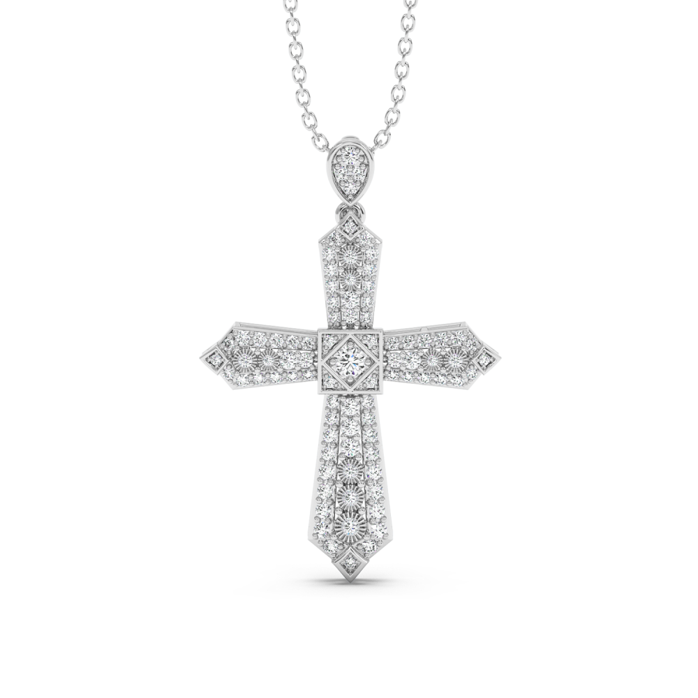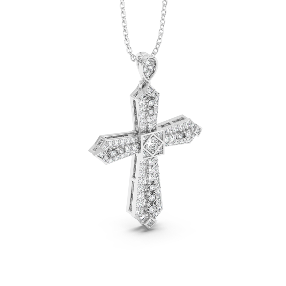 Pandantiv cruciulita din aur alb de 14 K, cu diamante de 0.49ct. Greutatea este de aproximativ 2.87 grame. Lungimea cruciulitei cu tot cu anoul de prindere este de 2.68cm. Pandantivul se poate face pe comanda si din aur de 18K, galben sau rose. Gramajele si caratajele sunt aproximative. Putem modifica designul in functie de bugetul dumneavoastra.