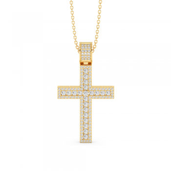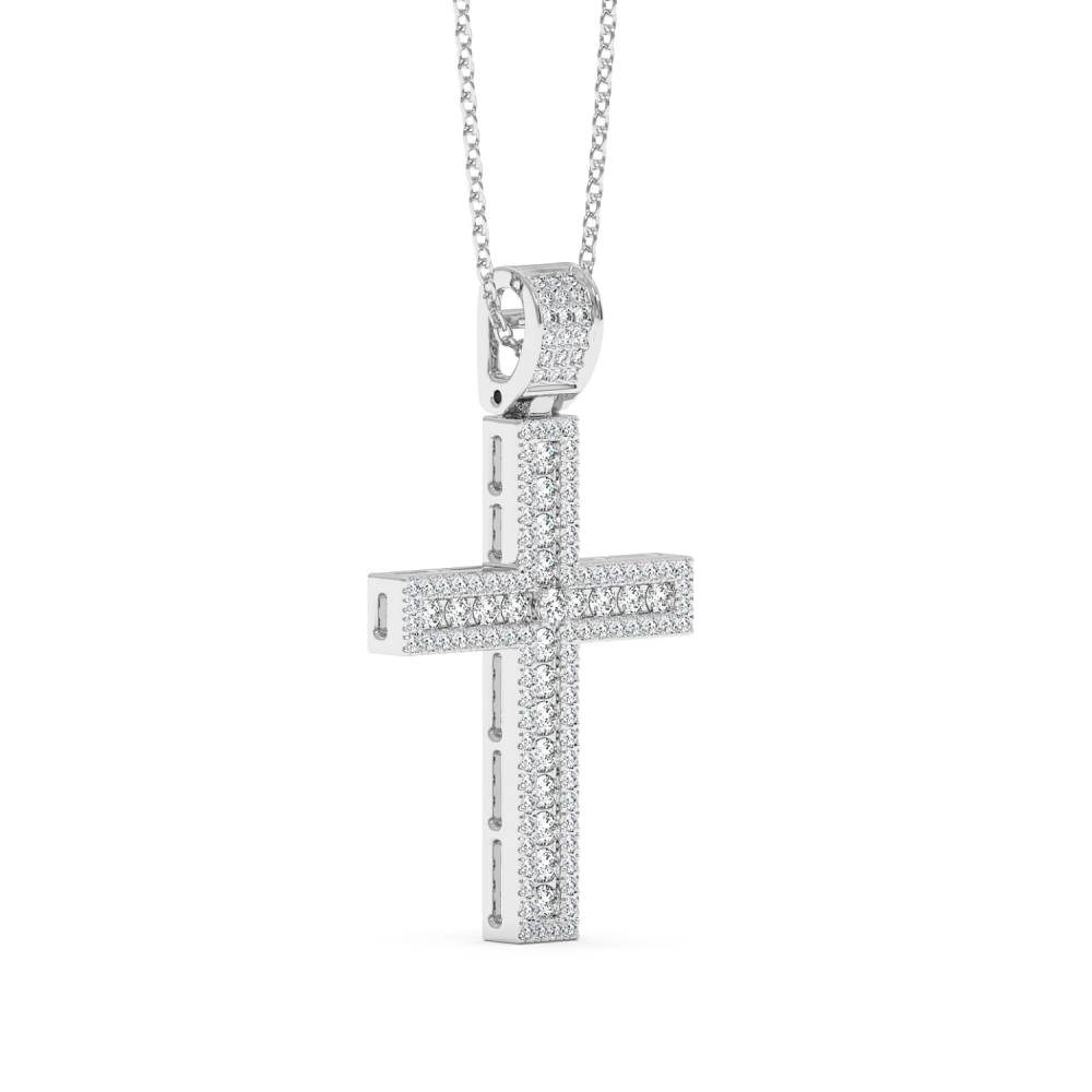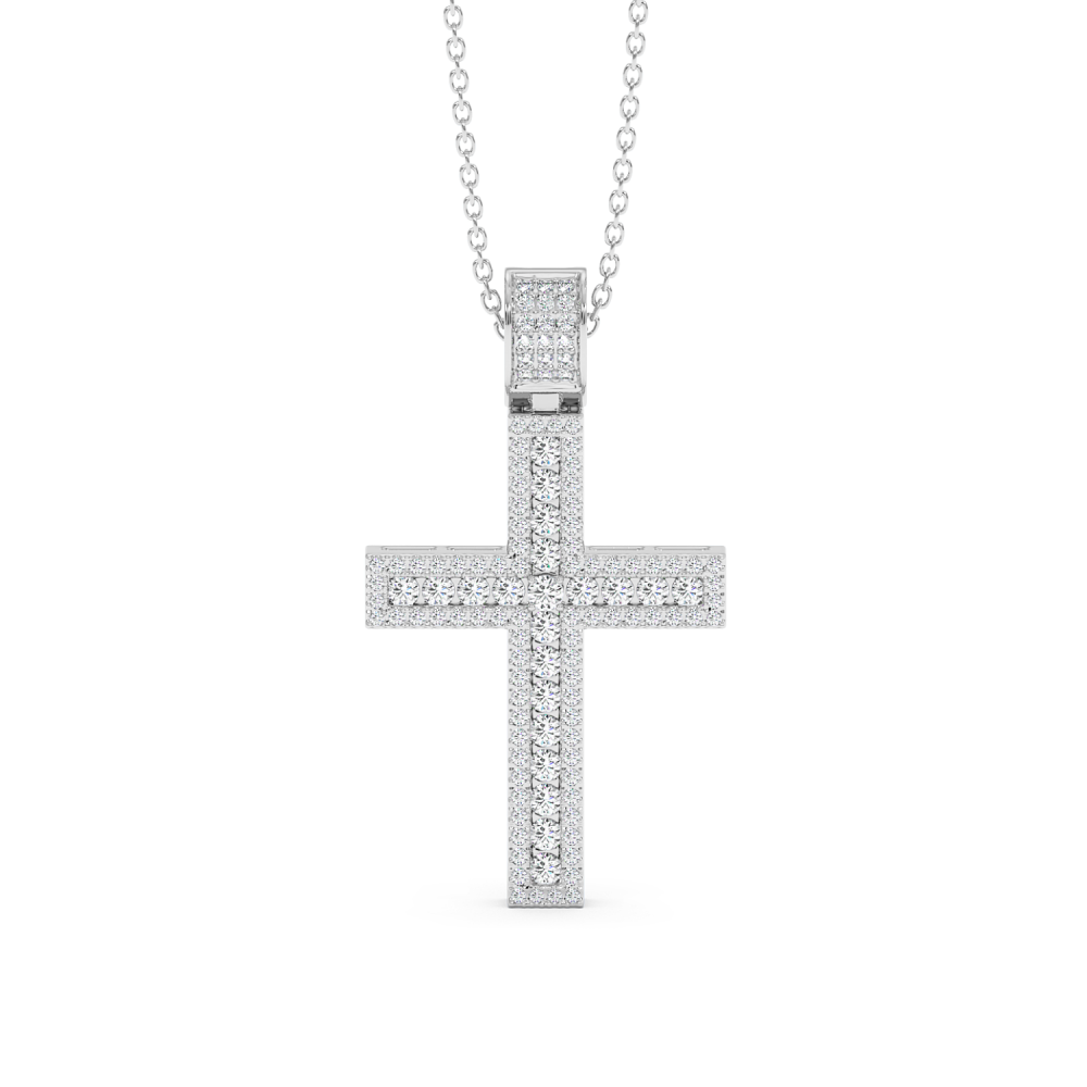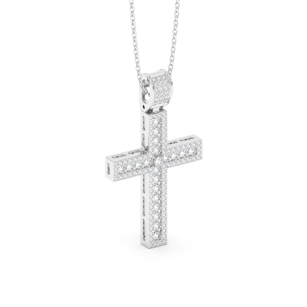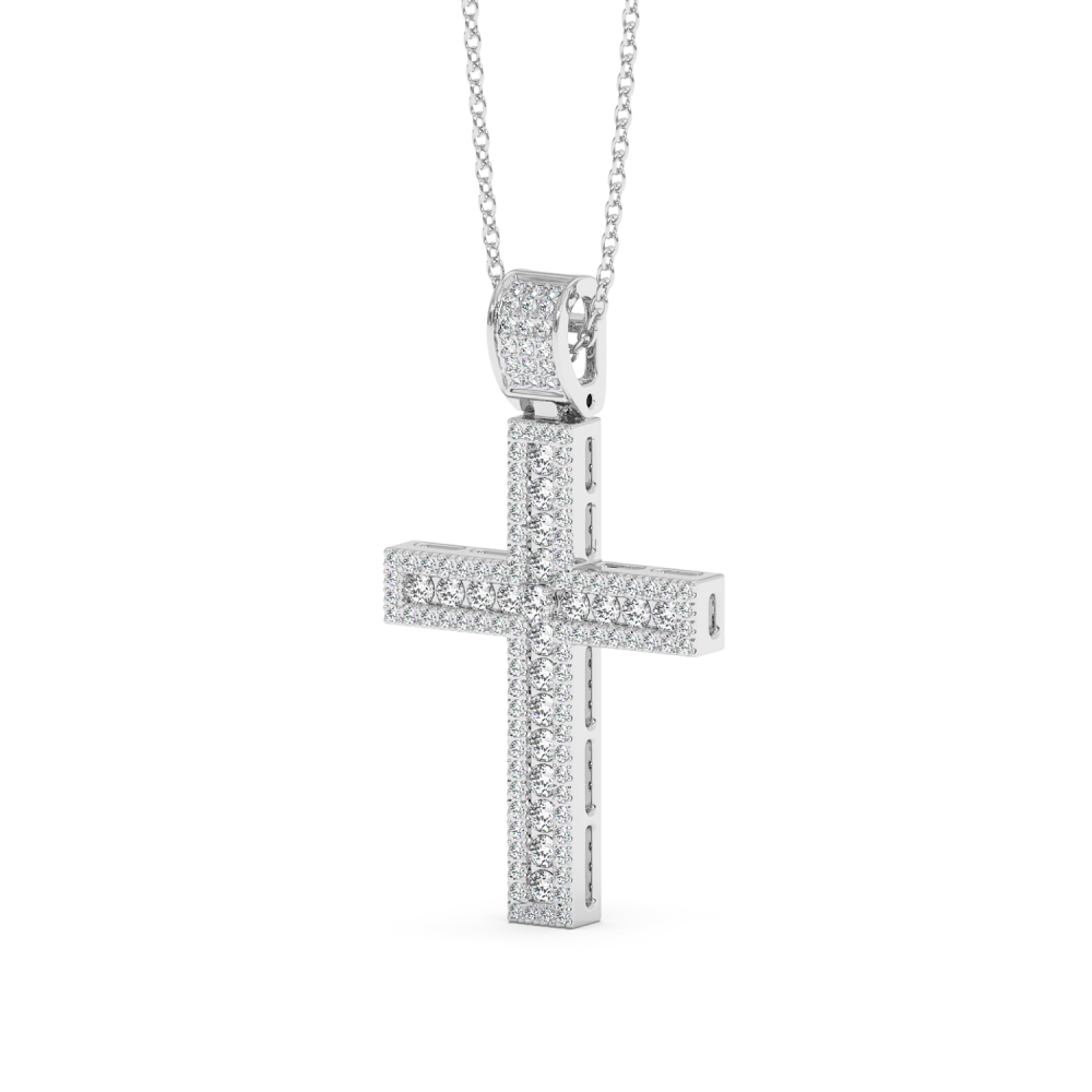 Pandantiv cruciulita din aur alb de 14 K, cu diamante de 0.87ct. Greutatea este de aproximativ 4.2 grame. Lungimea cruciulitei este de 2.66cm. Pandantivul se poate face pe comanda si din aur de 18K, galben sau rose. Gramajele si caratajele sunt aproximative. Putem modifica designul in functie de bugetul dumneavoastra.