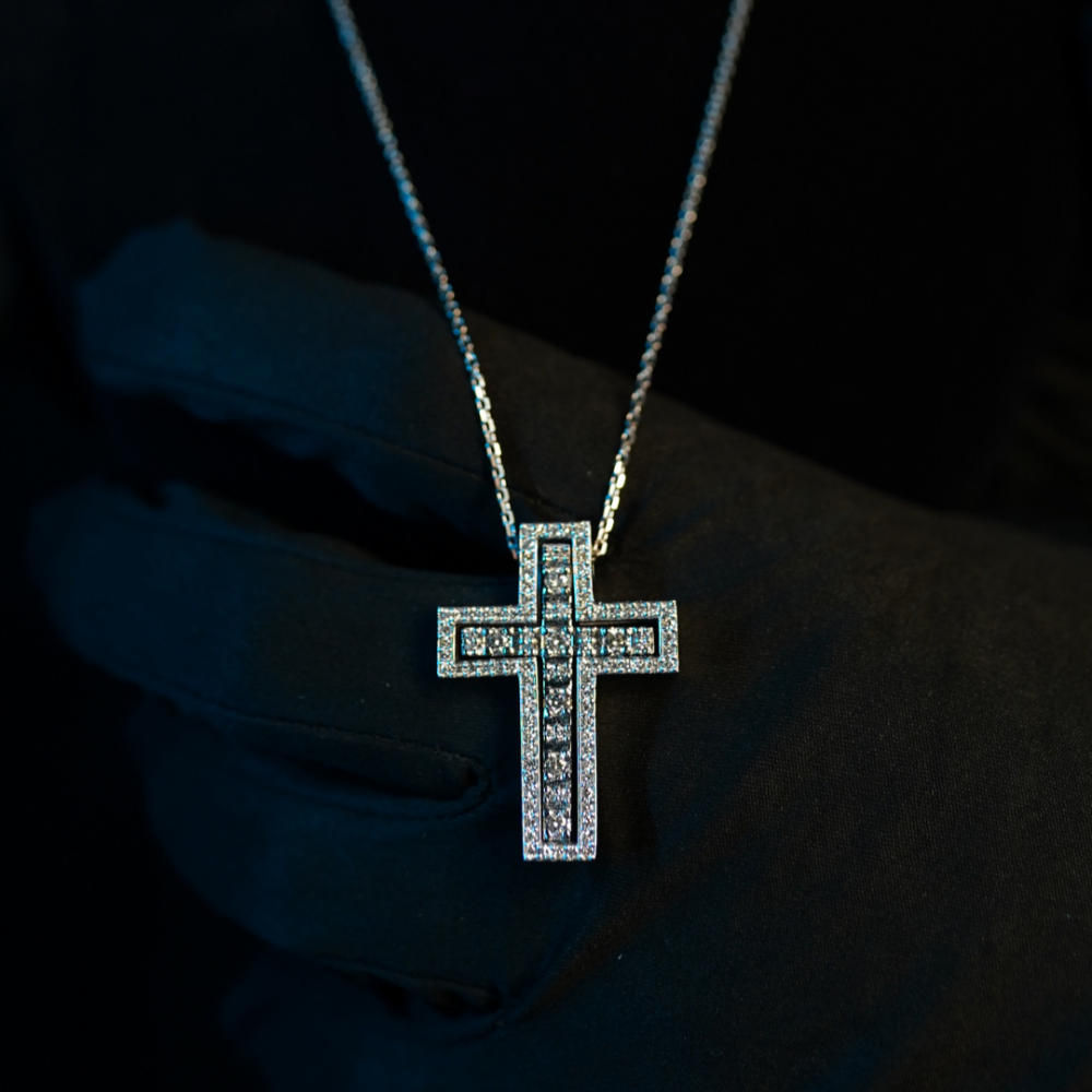 Pandantiv cruciulita din aur alb de 14K, cu diamante de 1.15 ct. Greutatea aproximativa a colierului este de 12.27 grame. Accesati "SPECIFICATII" pentru mai multe detalii despre acest produs. Pentru o evaluare corecta a diamantului, consultati graficul de mai...