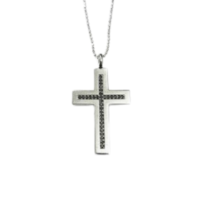 Pandantiv cruciulita din aur alb de 14 K, cu diamante negre de 0.70 ct. Greutatea colierului este de 5.54 grame.