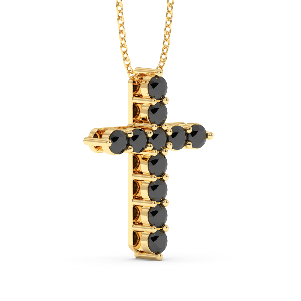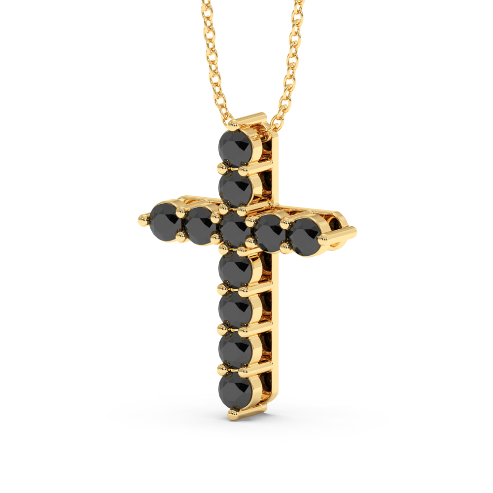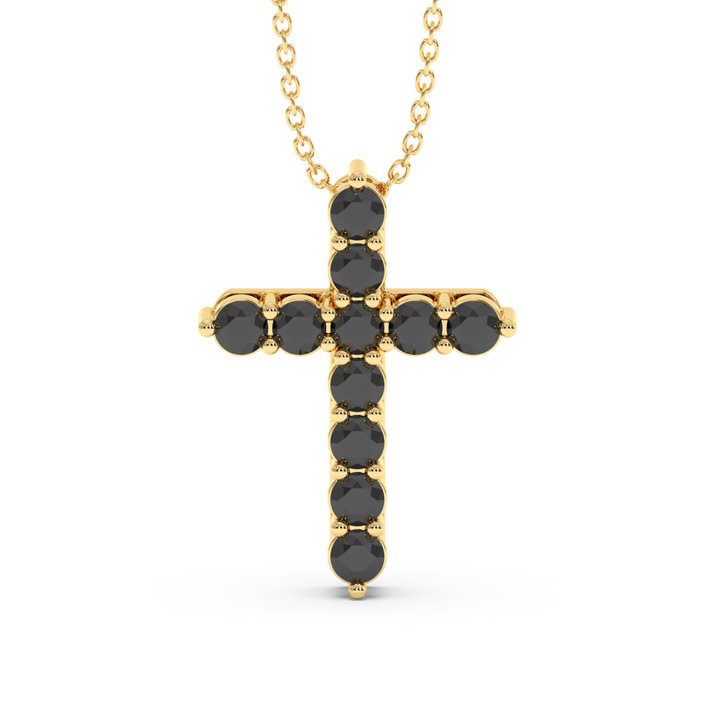 Pandantiv cruciulita din aur de 14 K, cu diamante negre de 1.10 ct. Greutatea cruciulitei este de aproximativ 6.00 grame, dimensiunea este de 23mm.