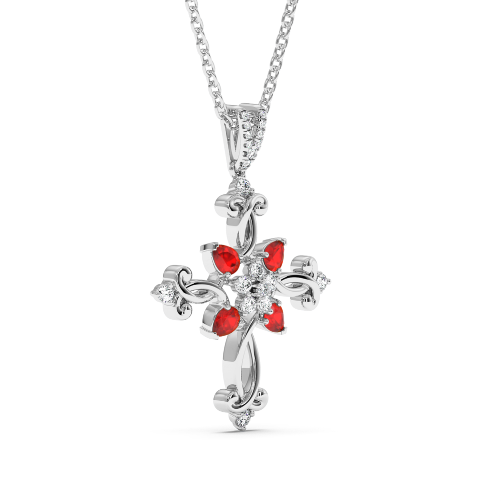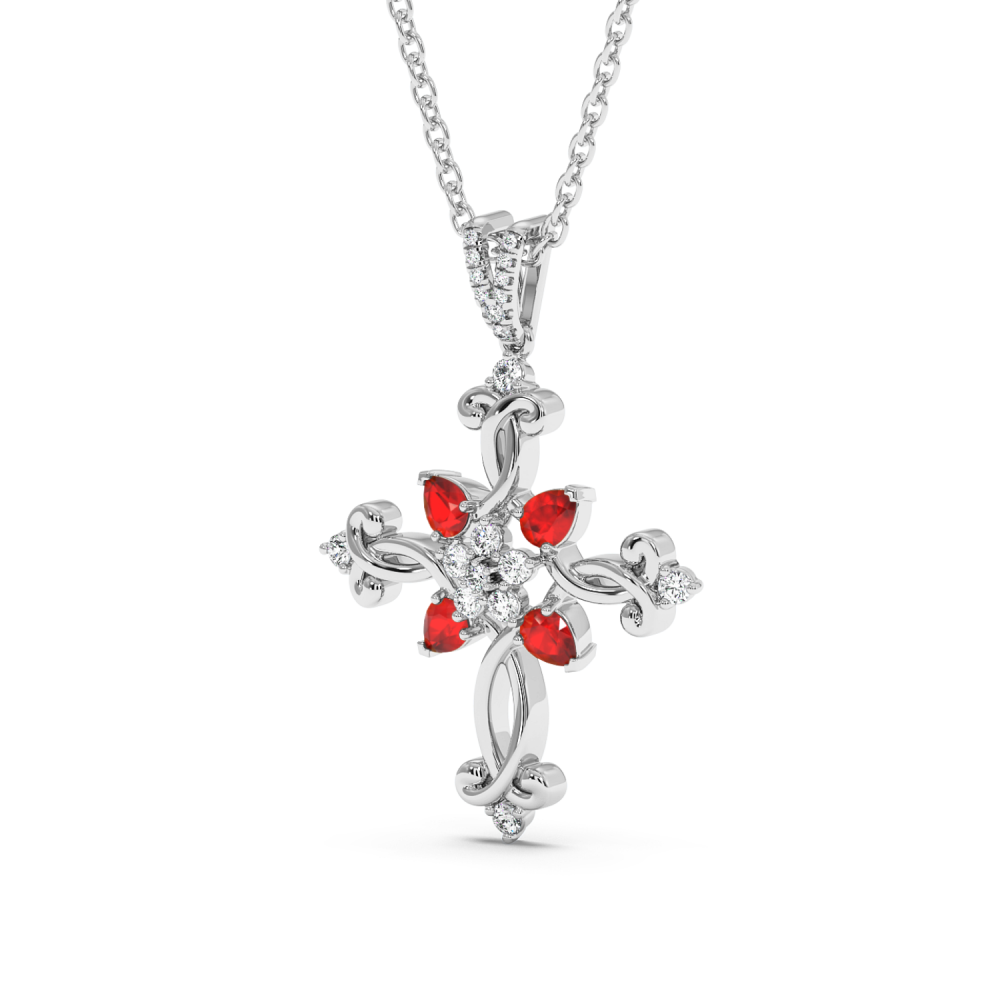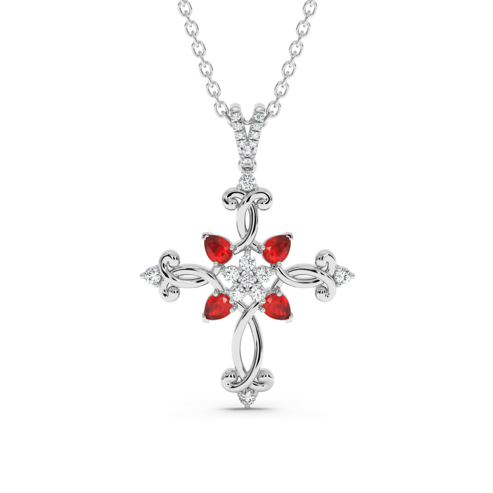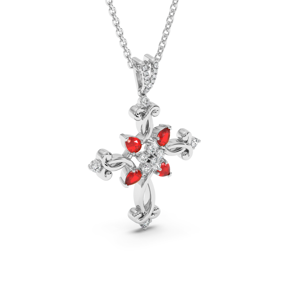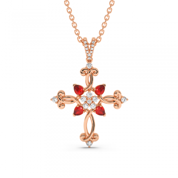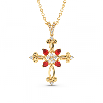 Pandantiv cruciulita din aur de 14 K, cu rubine de 0.84ct si diamante de 0.21ct. Greutatea este de aproximativ 5.67 grame.