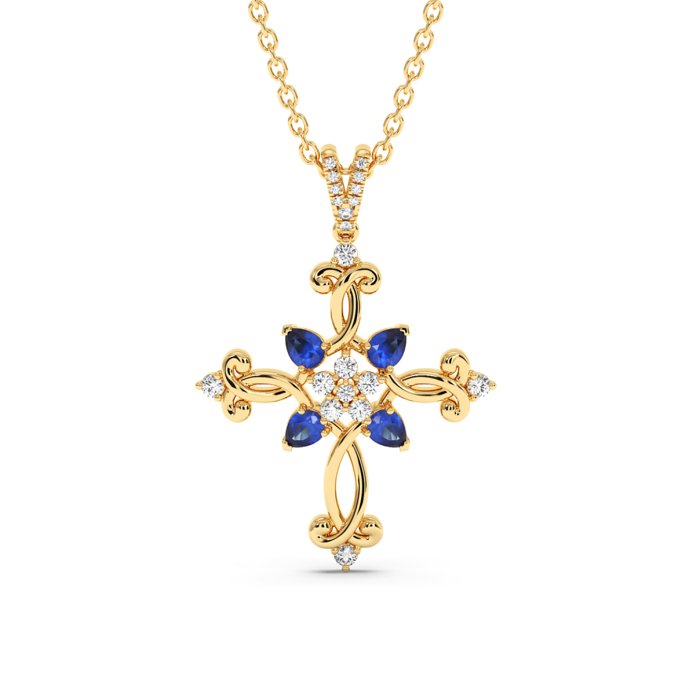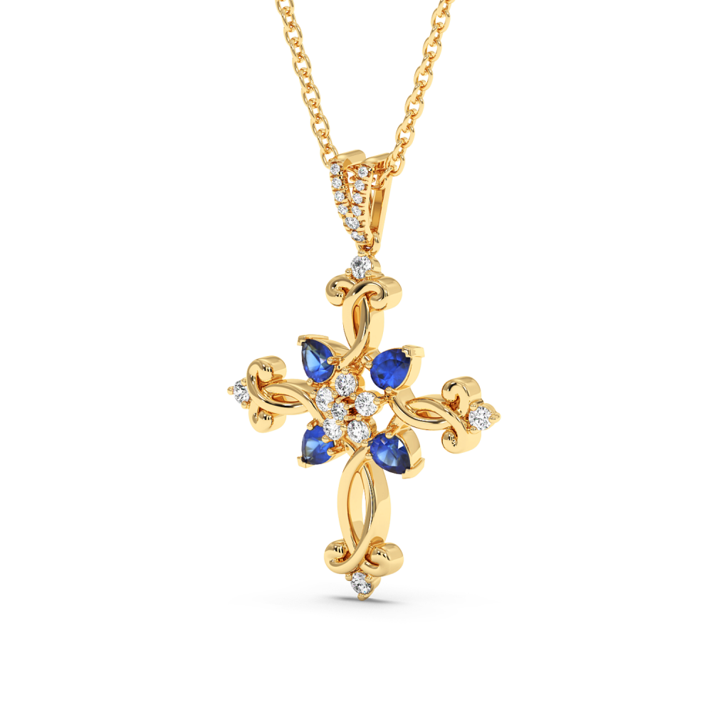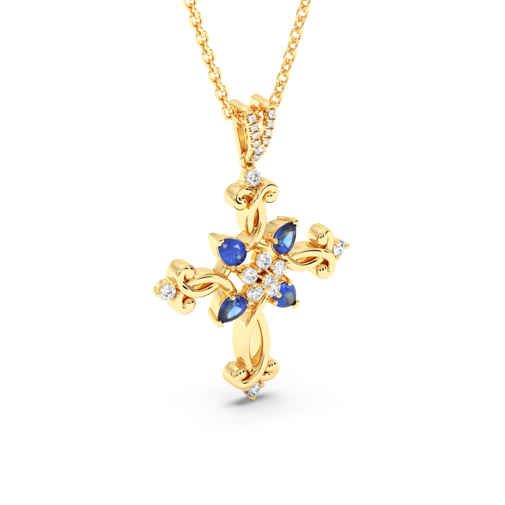 Pandantiv cruciulita din aur de 14 K, cu safir de 0.84ct si diamante de 0.21ct. Greutatea este de aproximativ 5.67 grame.