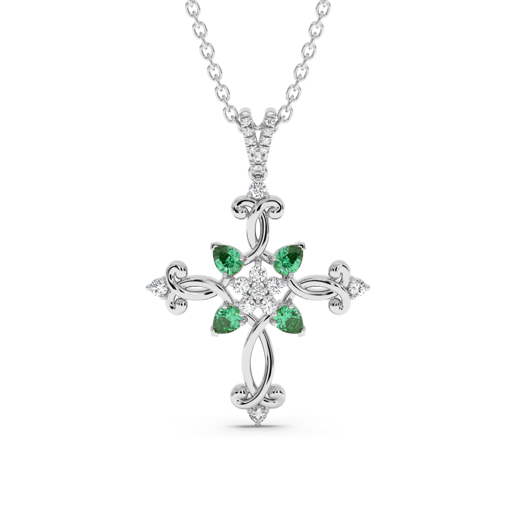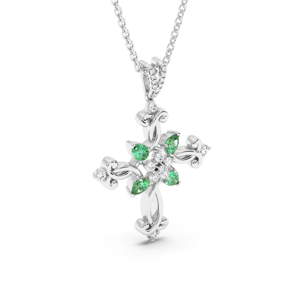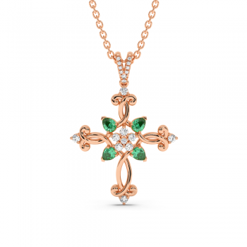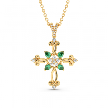 Pandantiv cruciulita din aur de 14 K, cu smaralde de 0.84ct si diamante de 0.21ct. Greutatea este de aproximativ 5.67 grame.