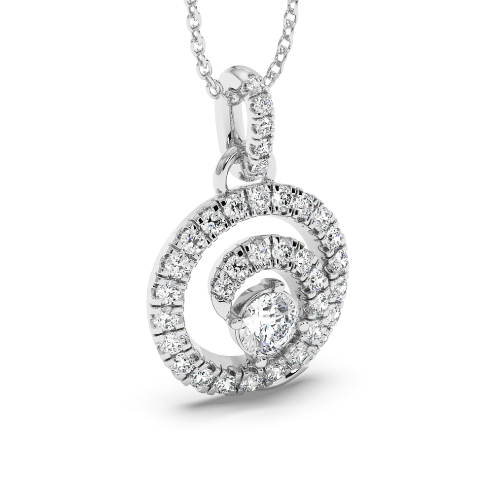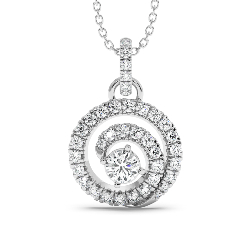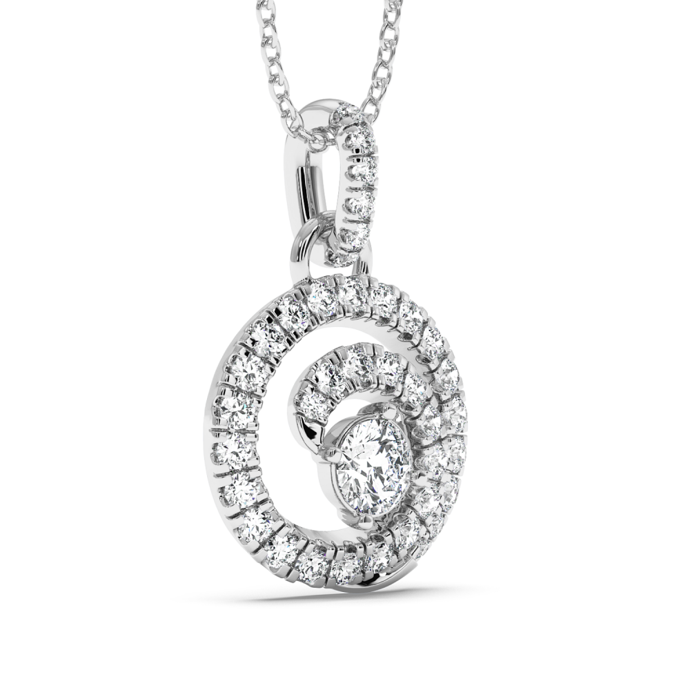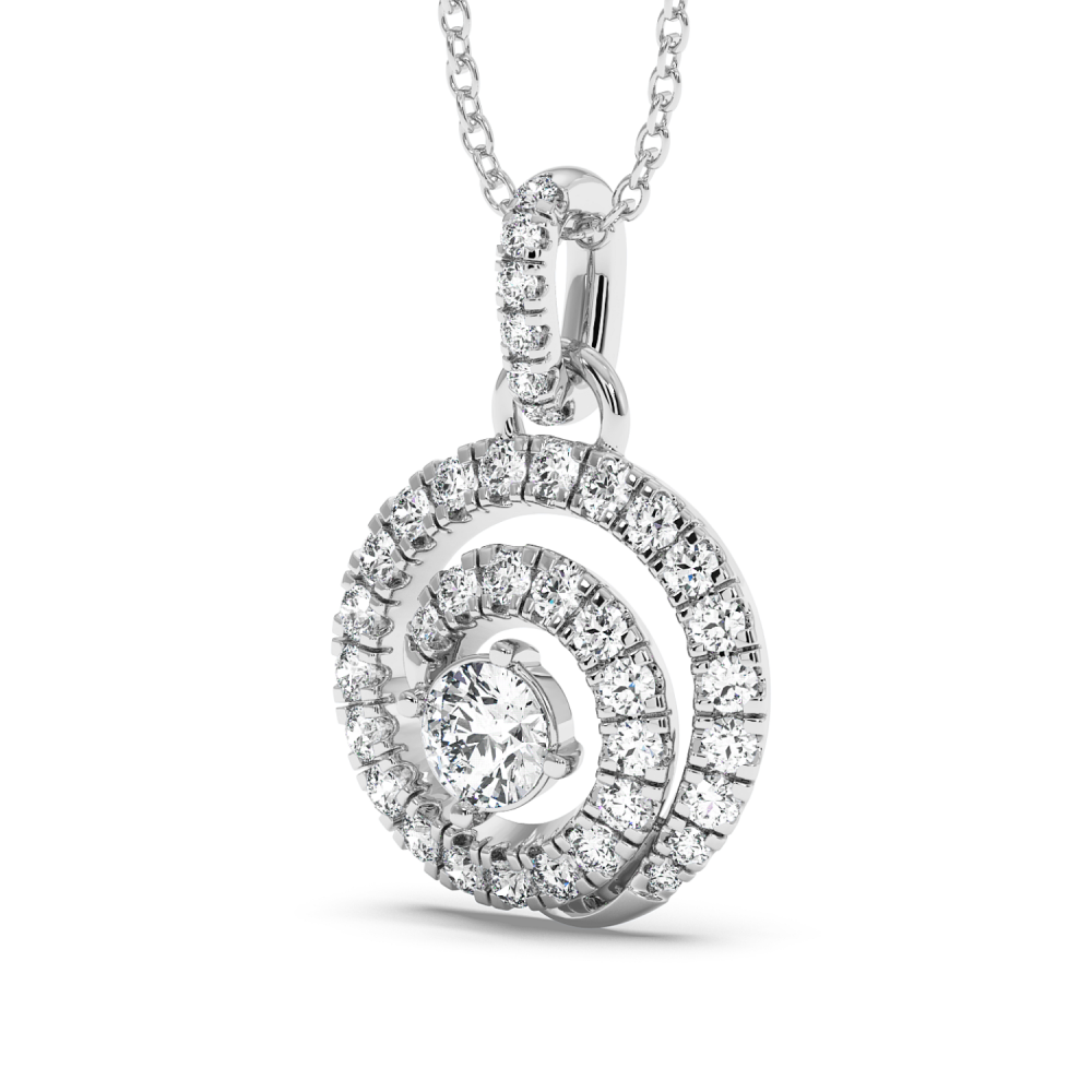 Pandantiv din aur alb de 14 K, cu diamant central de 0.29 ct si diamante laterale de 0.64 ct. Greutatea colierului este de apx 3.5 grame. Se poate confectiona din aur alb, galben sau rose.