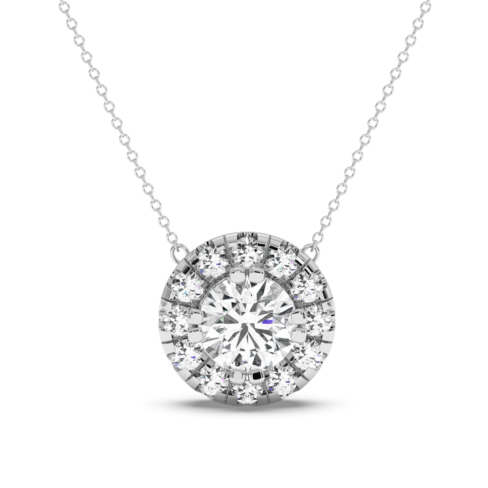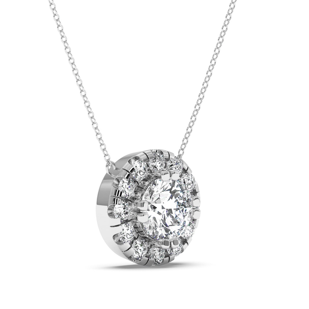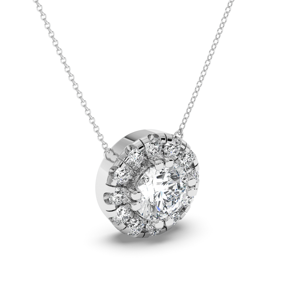 Pandantiv din aur alb de 14 K, cu diamant central de 0.45 ct si diamante laterale de 0.24 ct. Greutatea colierului este de apx 2.60 grame. Se poate confectiona din aur alb, galben sau rose.