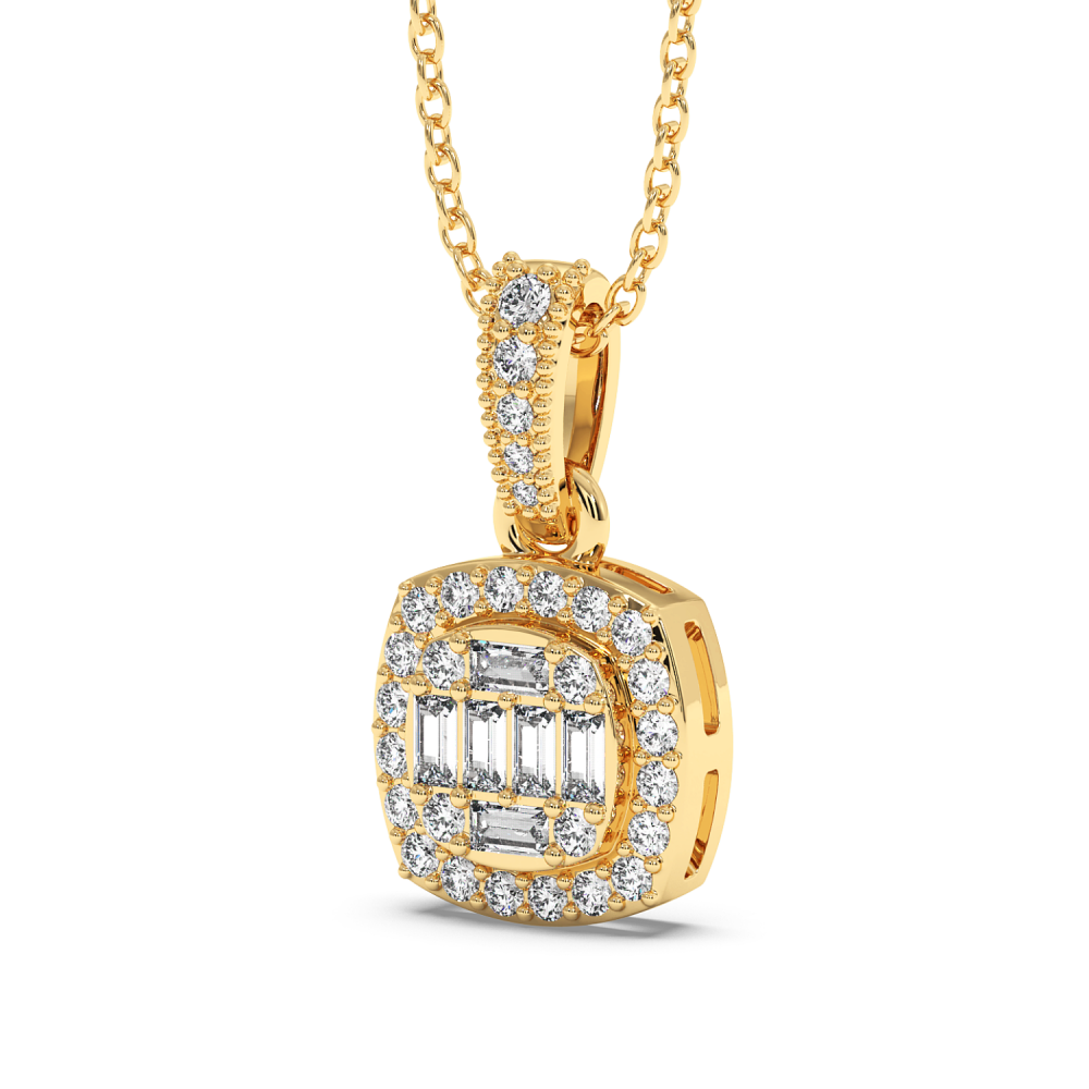 Pandantiv din aur alb de 14 K, cu diamante baget de 0.12 ct. si diamante rotunde de 0.23 ct. Greutatea colierului este de 2.79 grame. Accesati "SPECIFICATII" pentru mai multe detalii despre acest produs. Pentru o evaluare corecta a diamantului, consultati graficul...