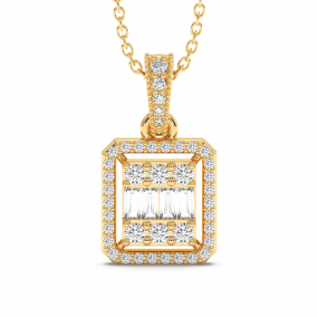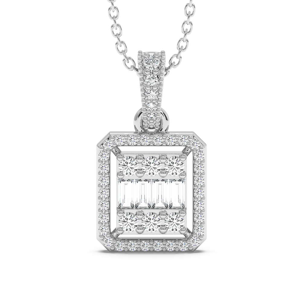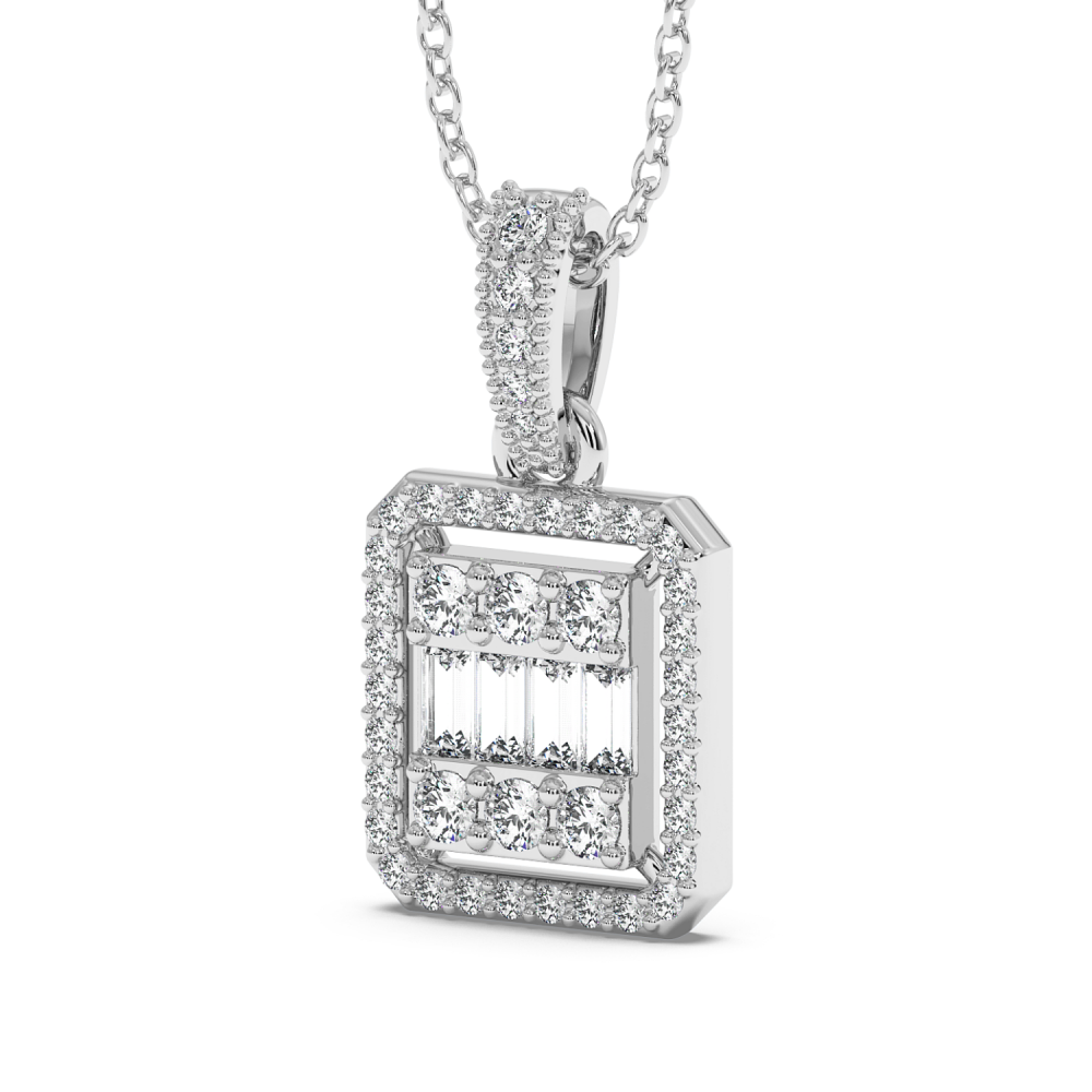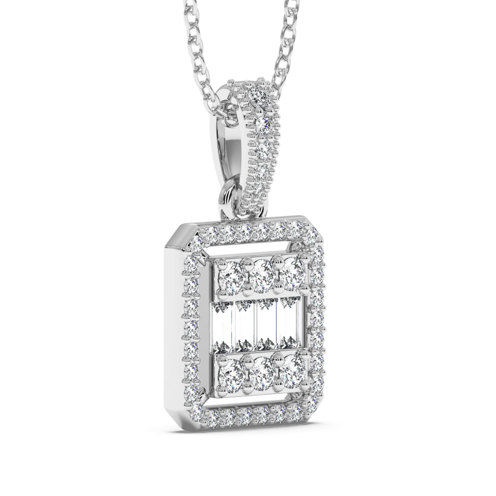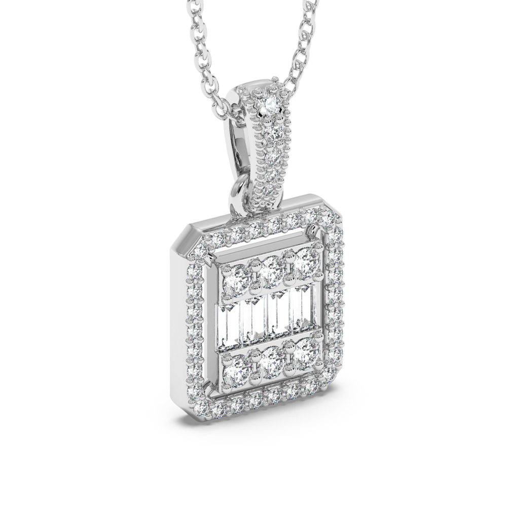 Pandantiv din aur alb de 14 K, cu diamante baget de 0.12 ct. si diamante rotunde de 0.35 ct. Greutatea pandantivului este de aproximativ 3,63 grame. Accesati "SPECIFICATII" pentru mai multe detalii despre acest produs