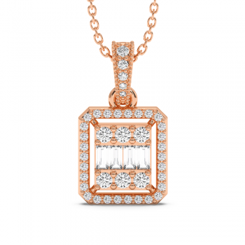 Pandantiv din aur alb de 14 K, cu diamante baget de 0.12 ct. si diamante rotunde de 0.35 ct. Greutatea pandantivului este de aproximativ 3,63 grame.