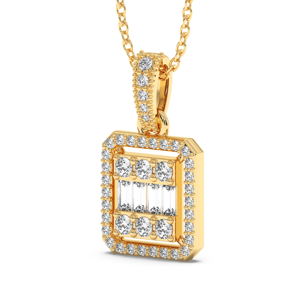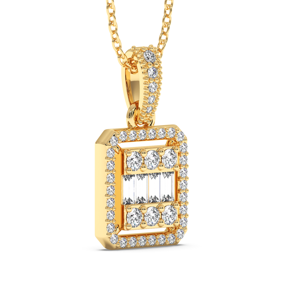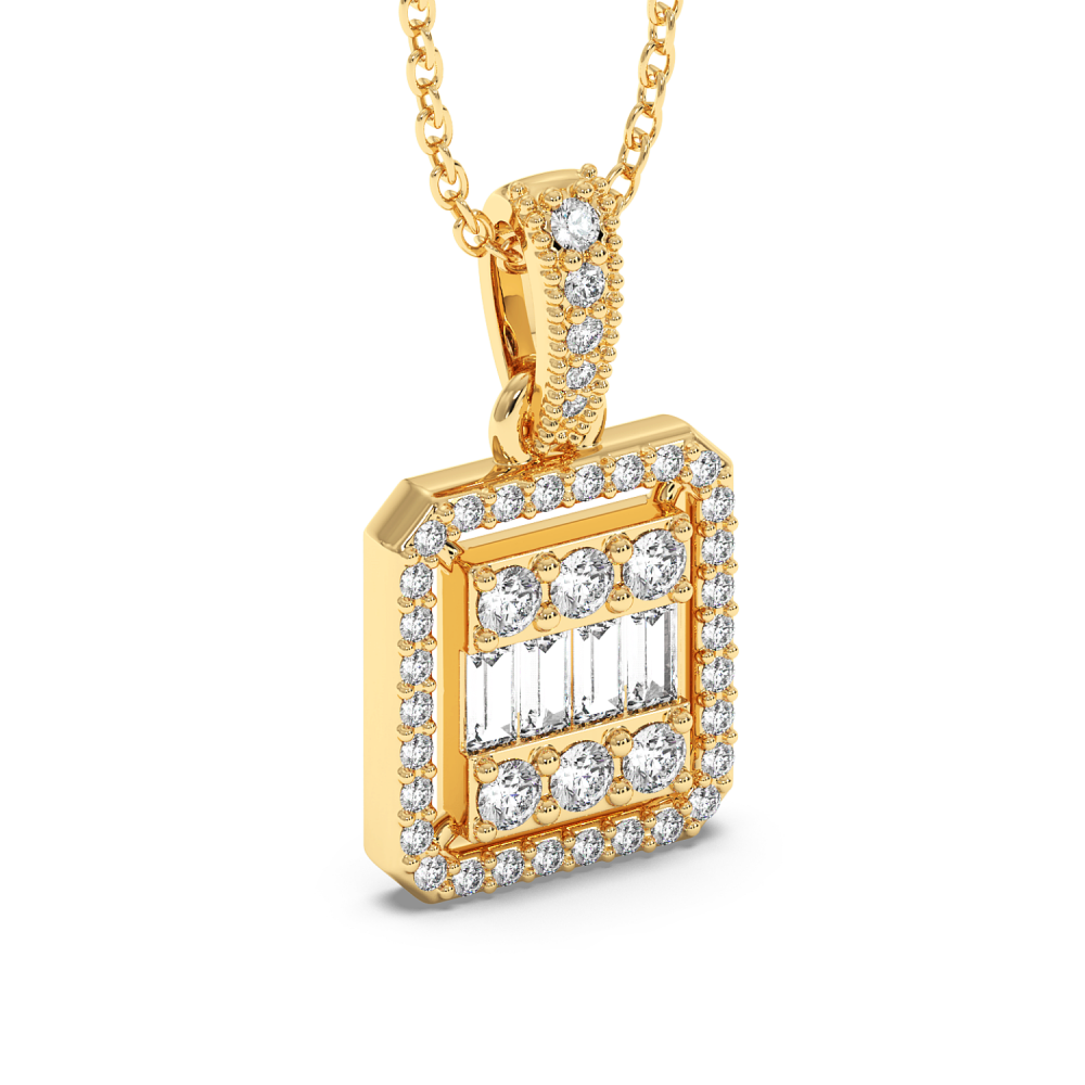 Pandantiv din aur alb de 14 K, cu diamante baget de 0.12 ct. si diamante rotunde de 0.35 ct. Greutatea pandantivului este de aproximativ 3,63 grame.