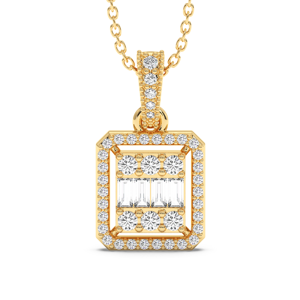 Pandantiv din aur alb de 14 K, cu diamante baget de 0.12 ct. si diamante rotunde de 0.35 ct. Greutatea pandantivului este de aproximativ 3,63 grame. Accesati "SPECIFICATII" pentru mai multe detalii despre acest produs
