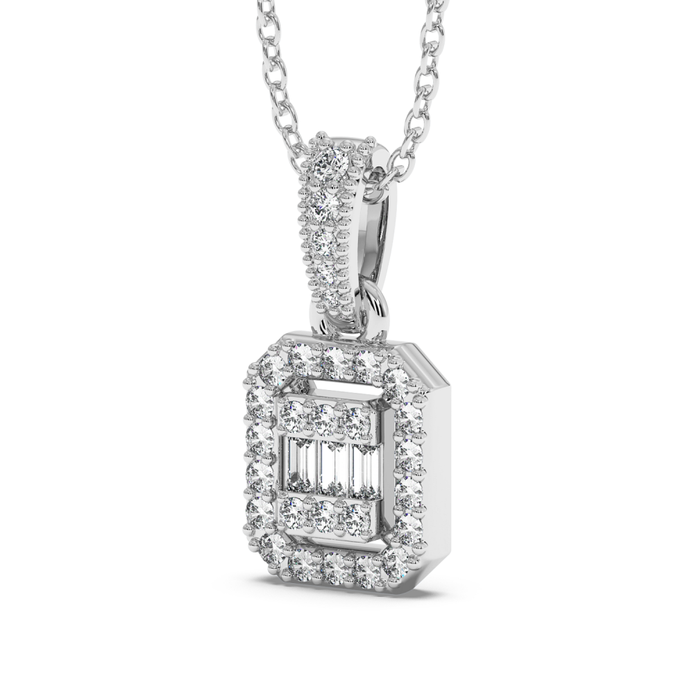 Pandantiv din aur alb de 14 K, cu diamante bagheta de 0.05 ct. si diamante rotunde de 0.25 ct. Greutatea colierului este de 2.94 grame.