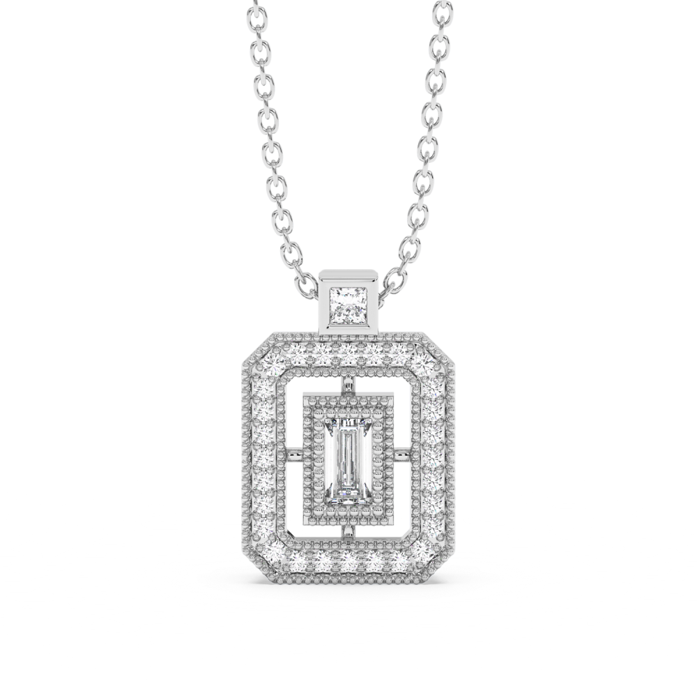 Pandantiv din aur alb de 14 K, cu diamante de 0.43 ct. Greutatea aproximativa a colierului este de aprox. 4 grame.