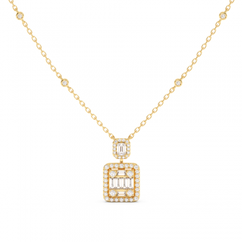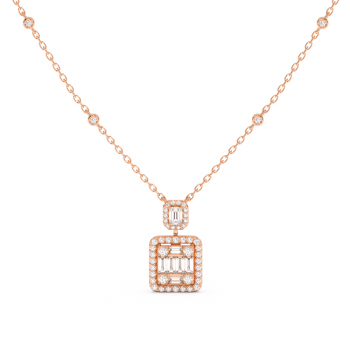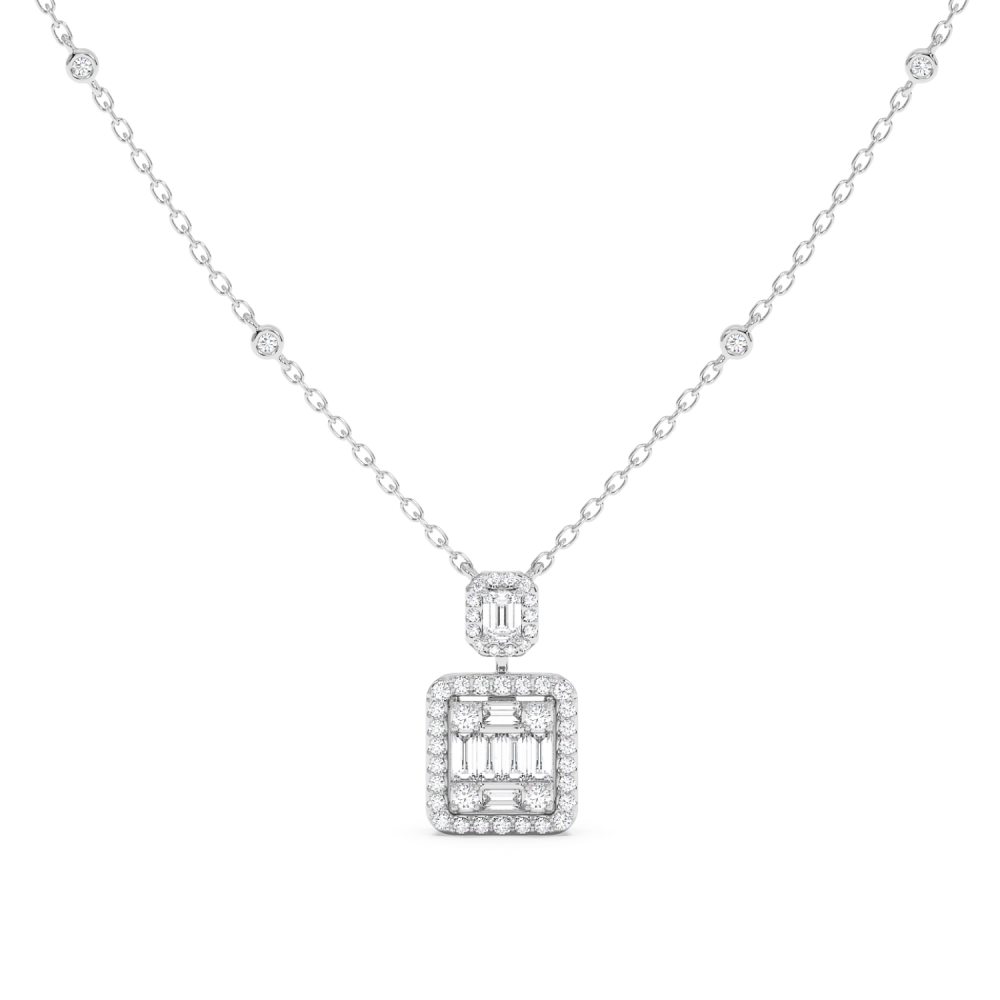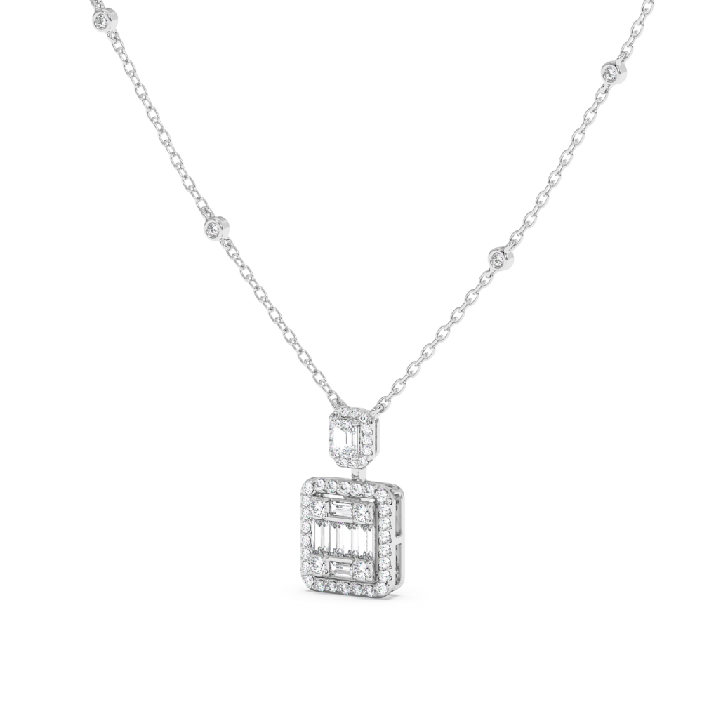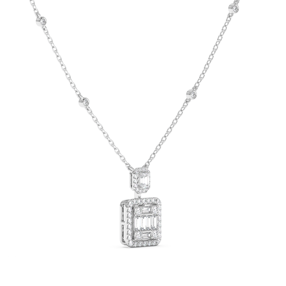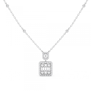 Pandantiv din aur alb de 14 K, cu diamante de 0.63 ct. Greutatea aproximativa a colierului este de aprox. 4 grame.