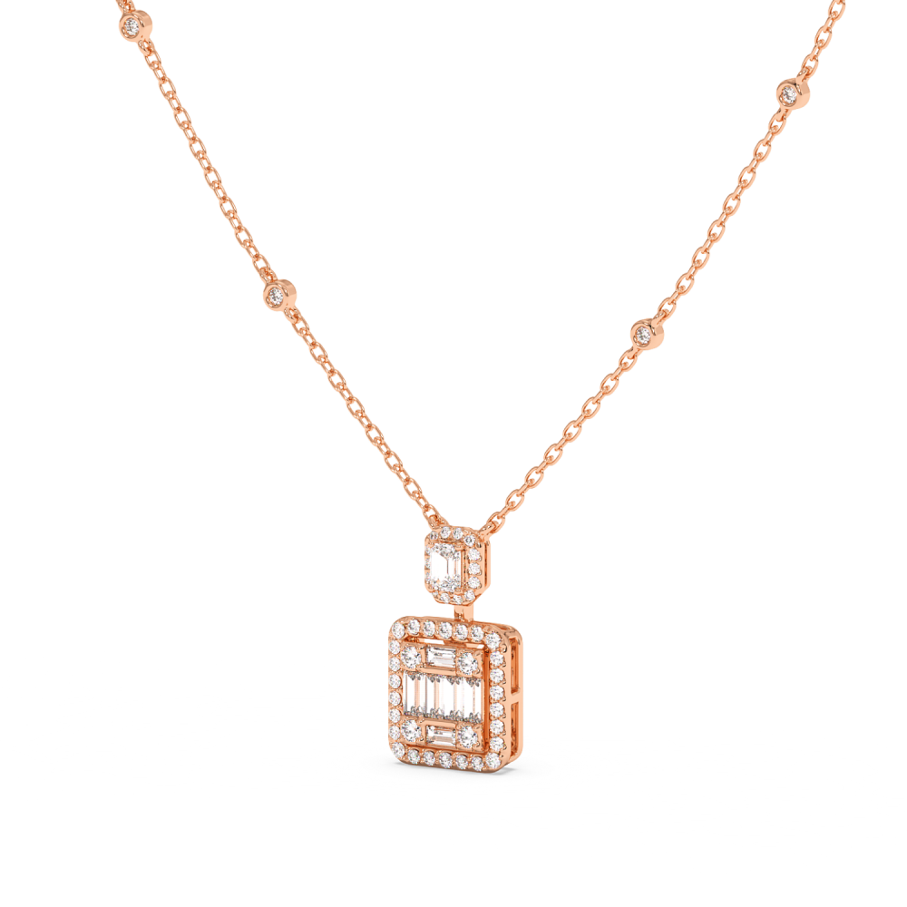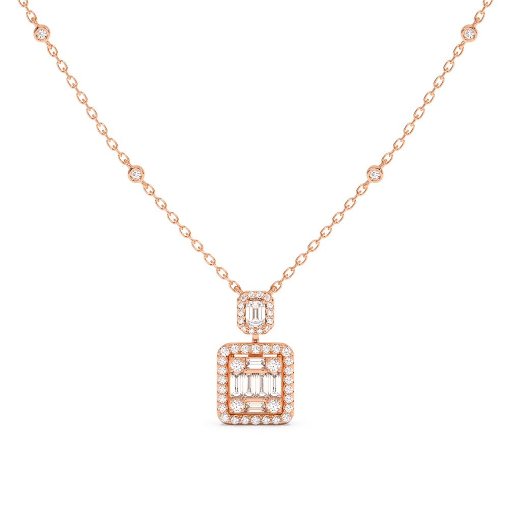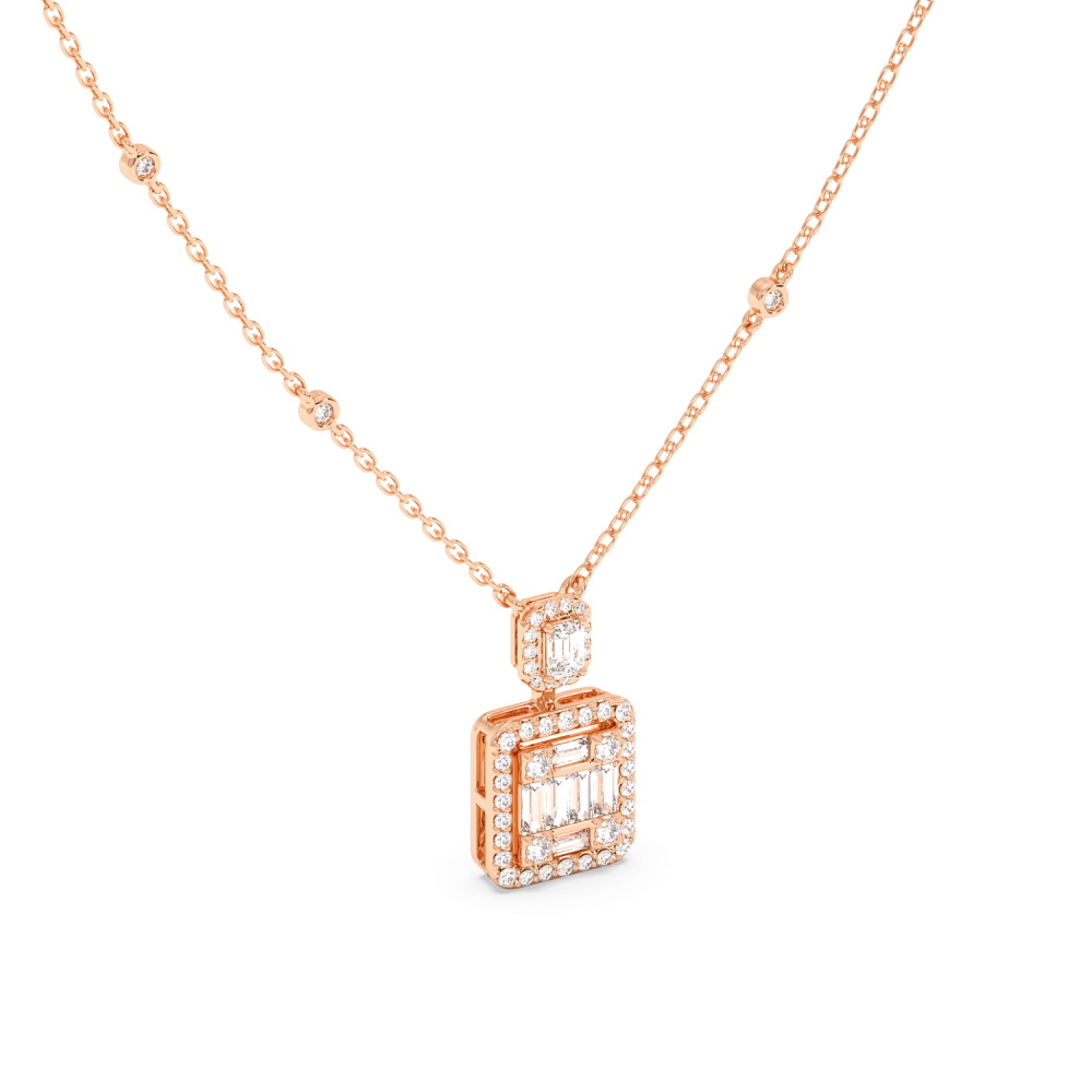 Pandantiv din aur alb de 14 K, cu diamante de 0.63 ct. Greutatea aproximativa a colierului este de aprox. 4 grame.