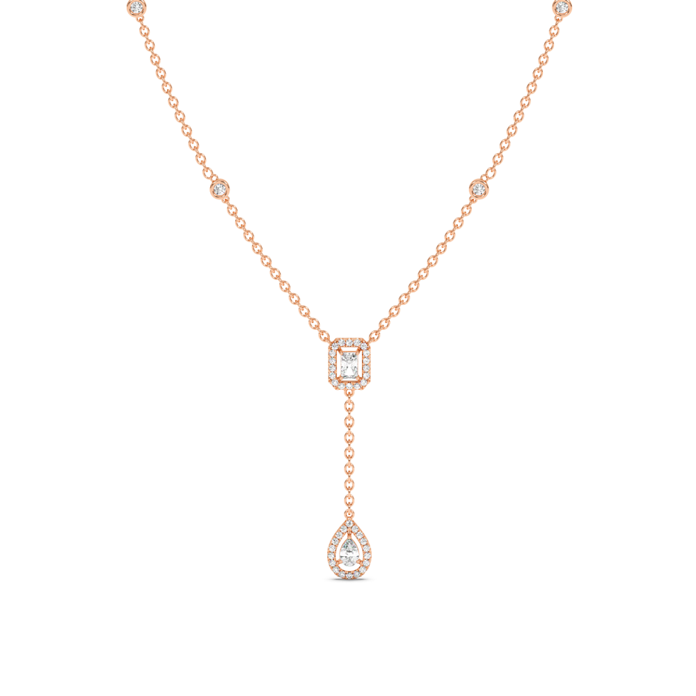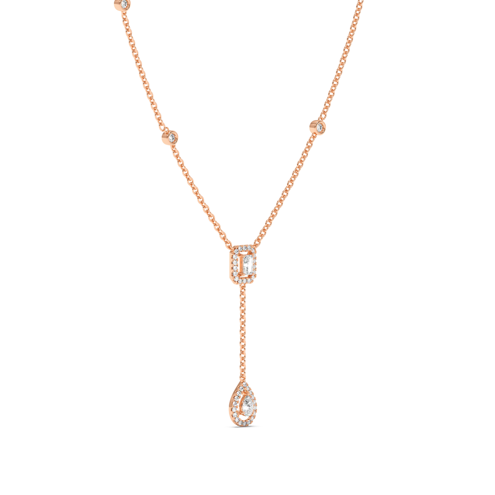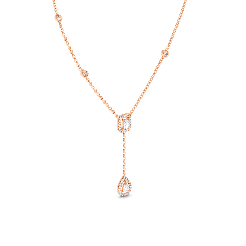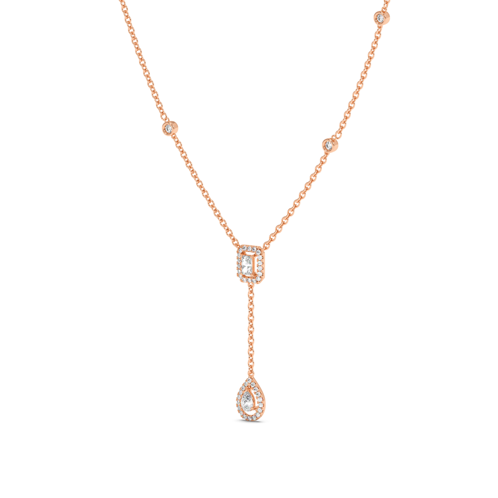 Pandantiv din aur alb de 14 K, cu diamante rotunde de 0.62 ct, diamante pear de 0.31 ct si diamante radiant de 0.40 ct. Greutatea colierului este de 5.33 grame.