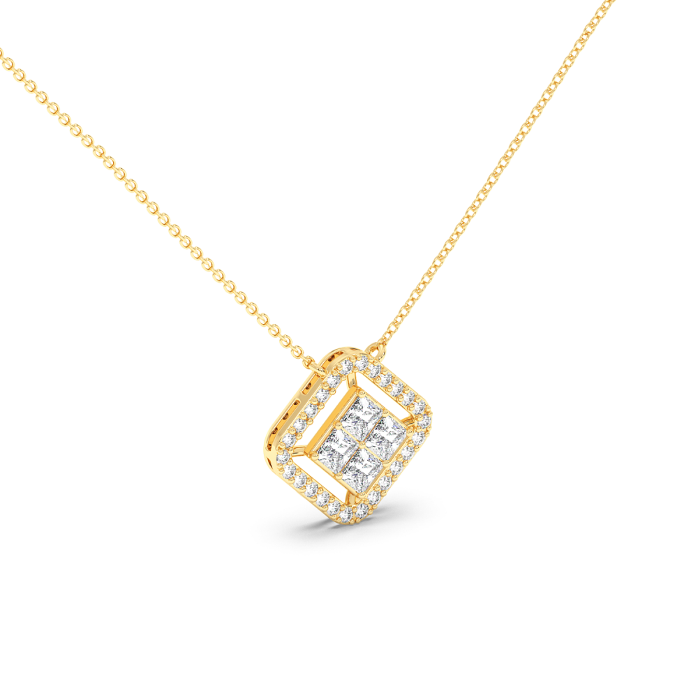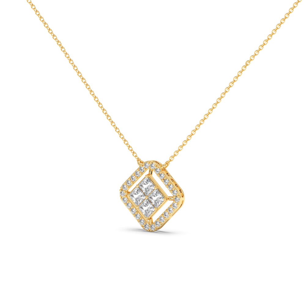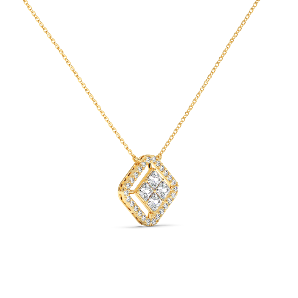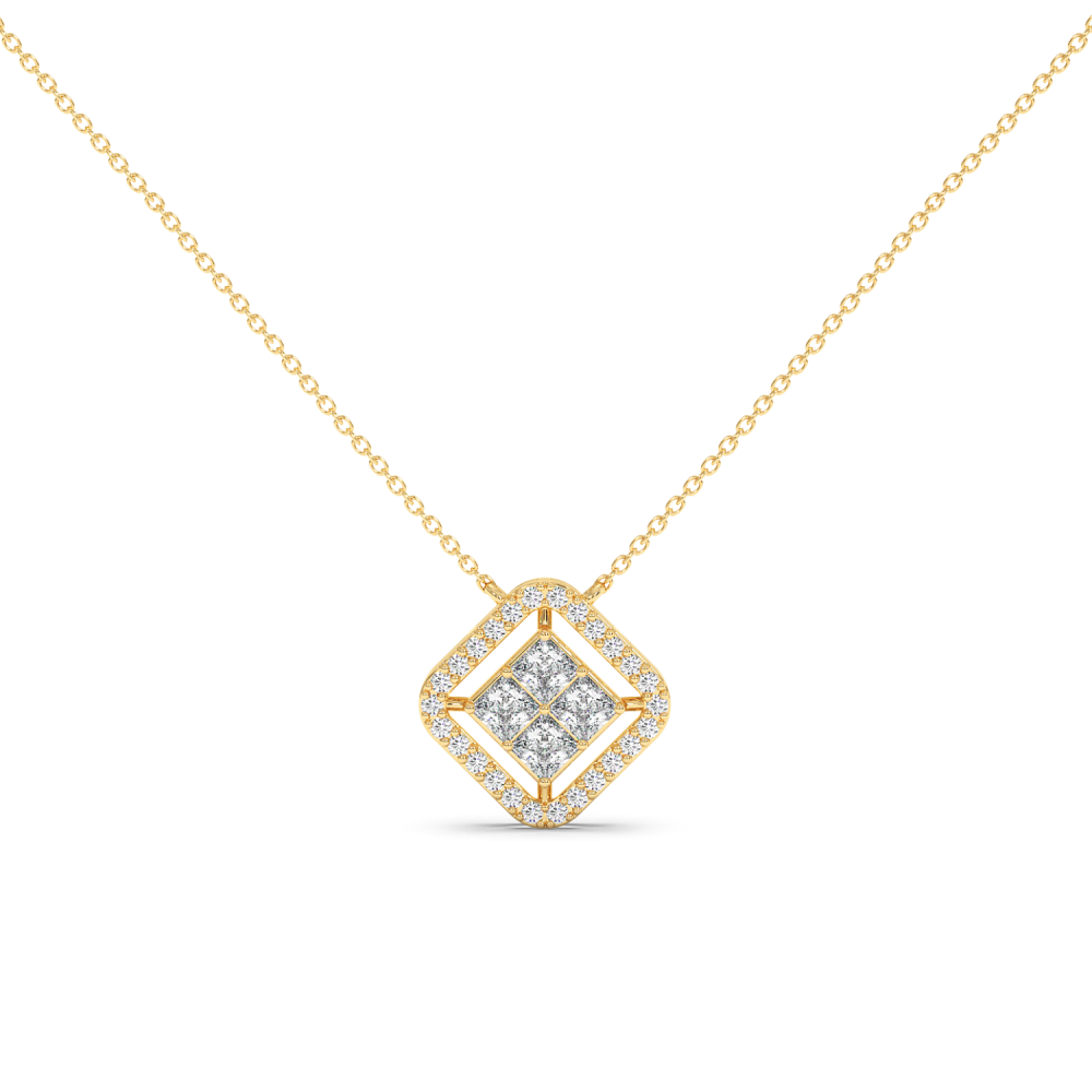 Pandantiv din aur de 14K, cu diamante Princess Cut de 0.96ct si diamante rotunde de 0.33ct. Greutatea este de aproximativ 1.91 grame. Pandantivul se poate face pe comanda si din aur de 18K, galben sau rose. Gramajele si caratajele sunt aproximative.