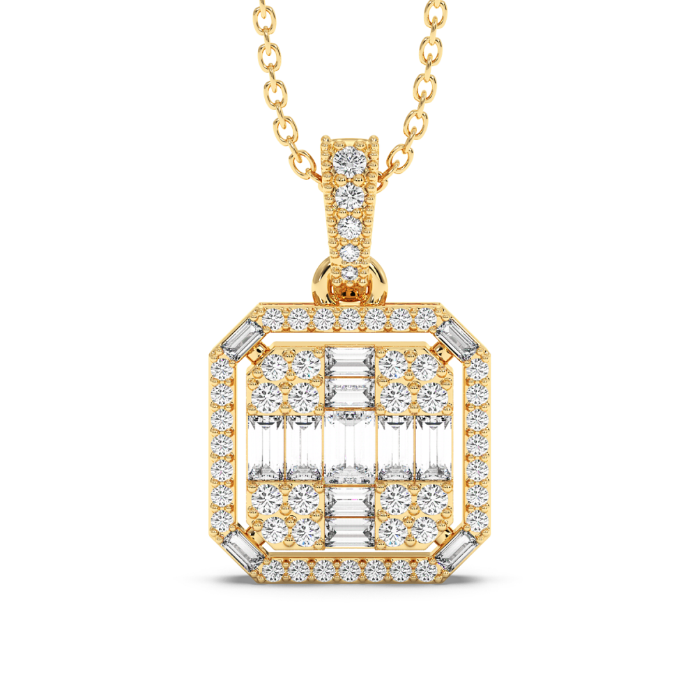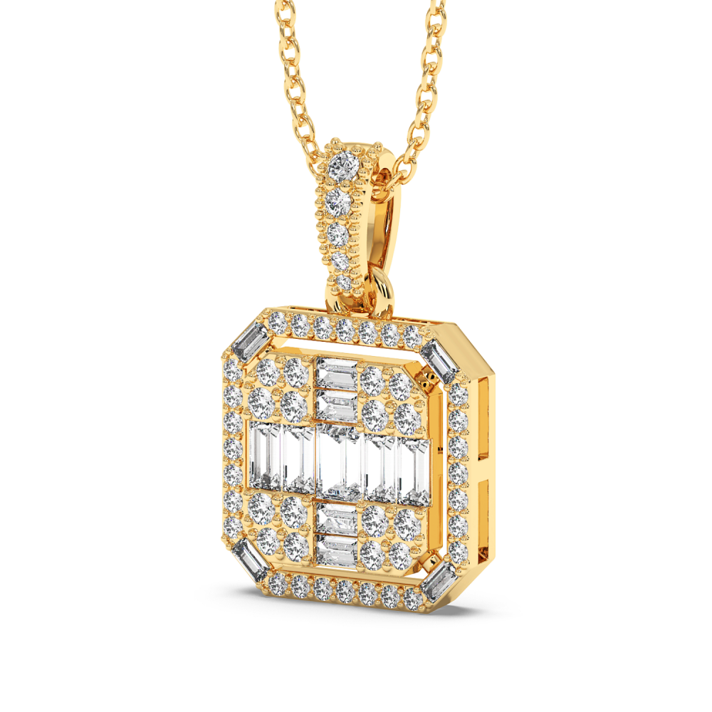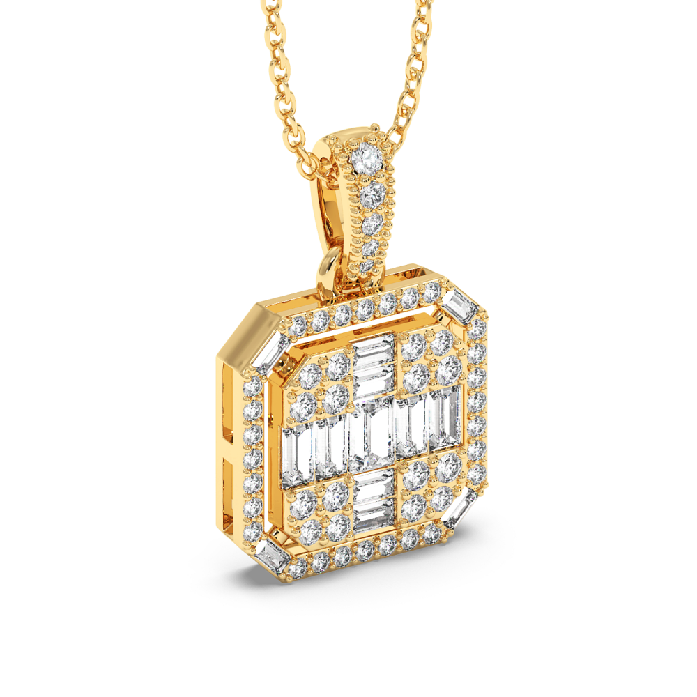 Pandantiv din aur alb de 14K, cu diamante rotunde de 0.34 ct si diamante baget de 0.28 ct. Greutatea pandantului este de aproximativ 3.88 grame.