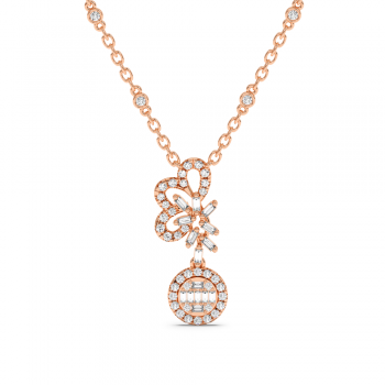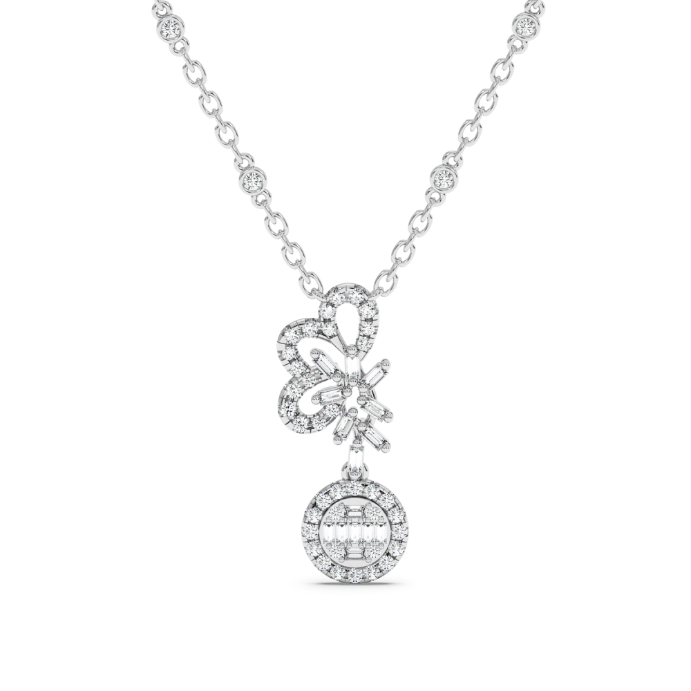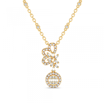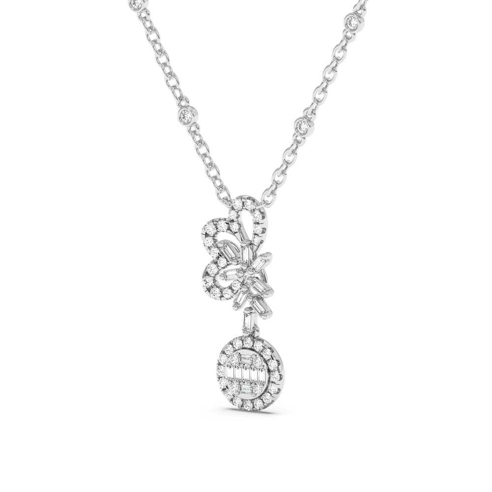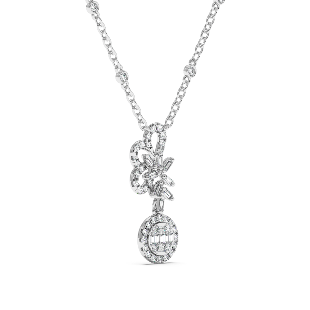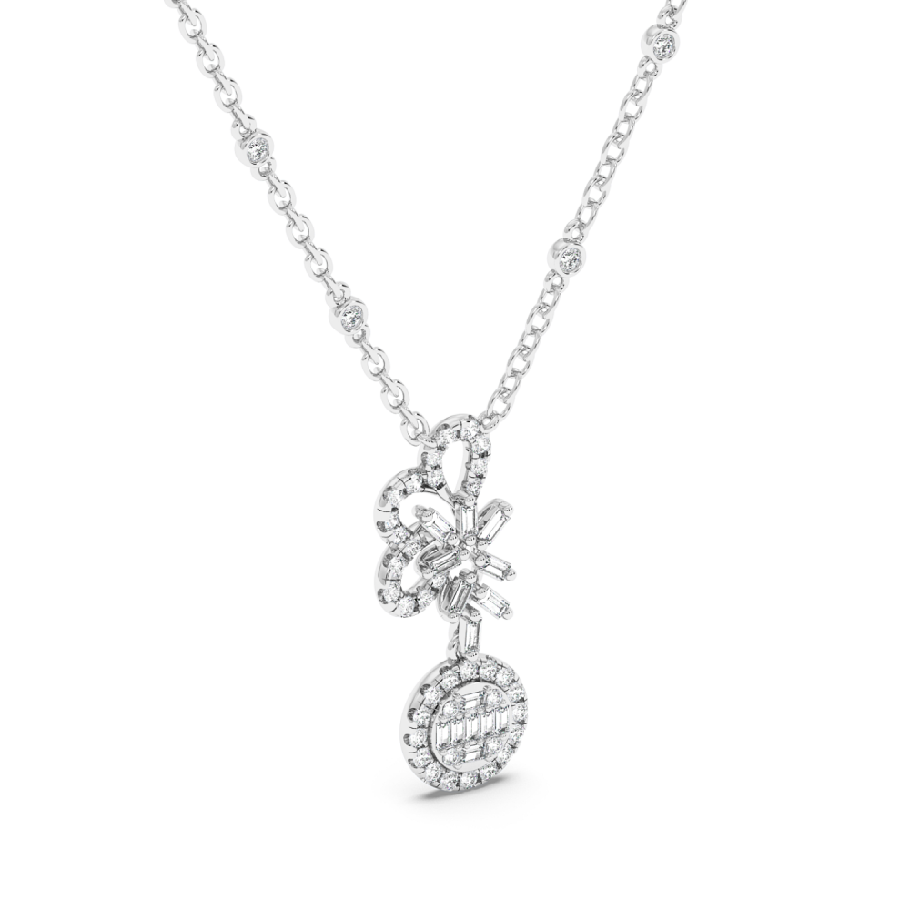 Pandantiv din aur alb de 14K, cu diamante rotunde de 0.36 ct si diamante bagheta de 0.18 ct. Greutatea pandantului este de apx 3.00 grame.