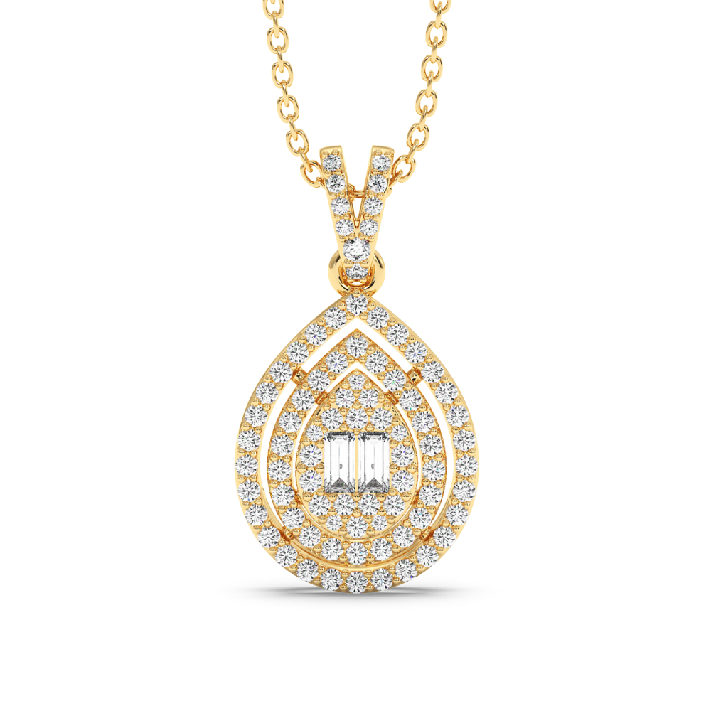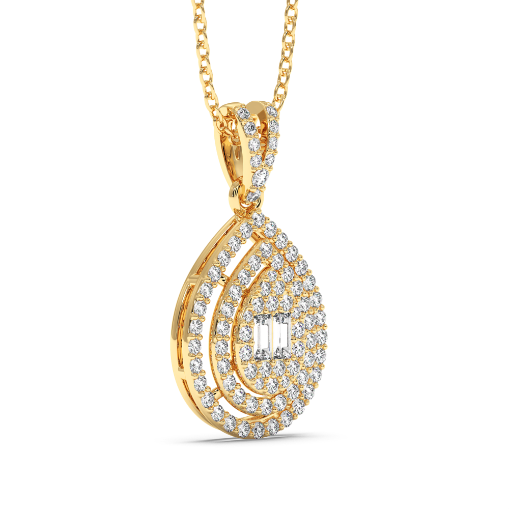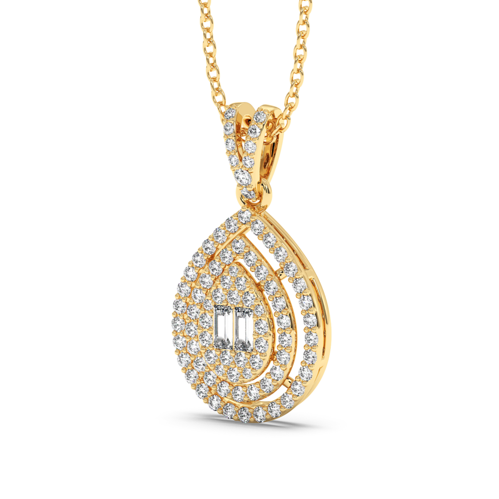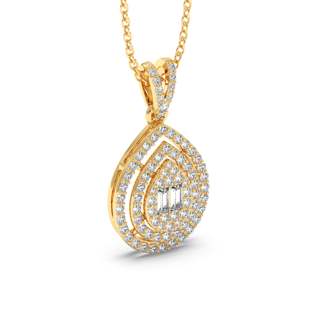 Pandantiv din aur alb de 14K, cu diamante rotunde de 0.46 ct si diamante baget de 0.06 ct. Greutatea pandantului este de aproximativ 2.88 grame.