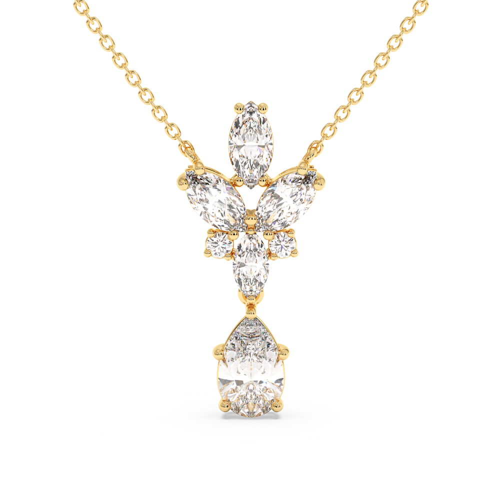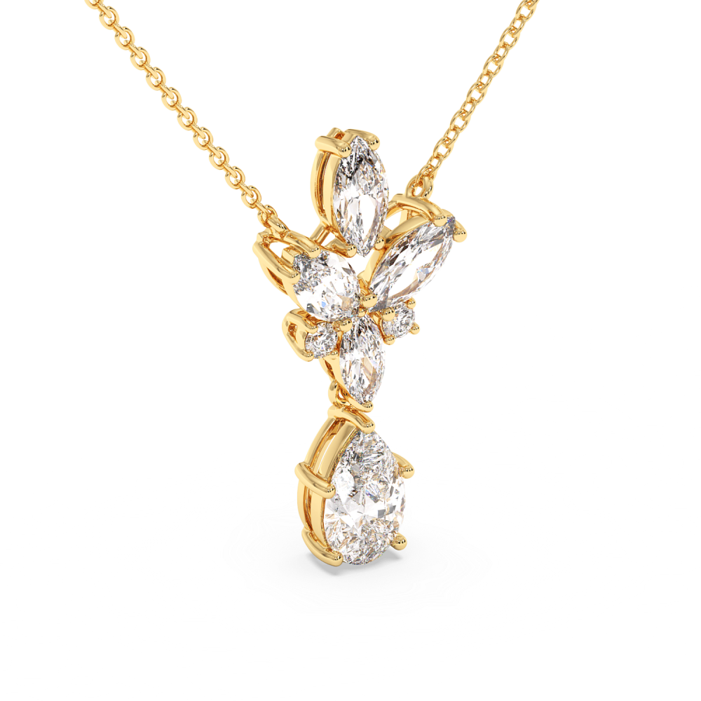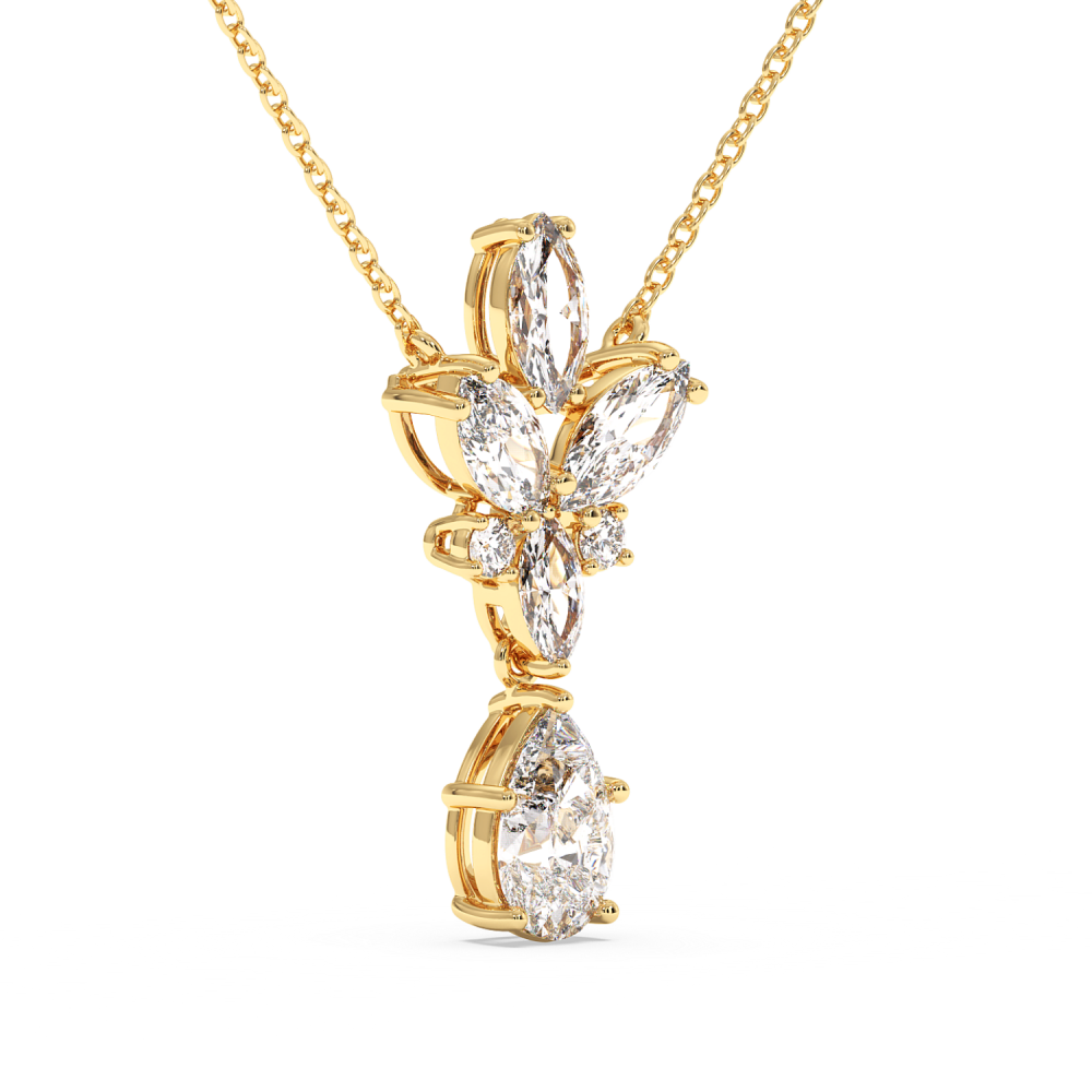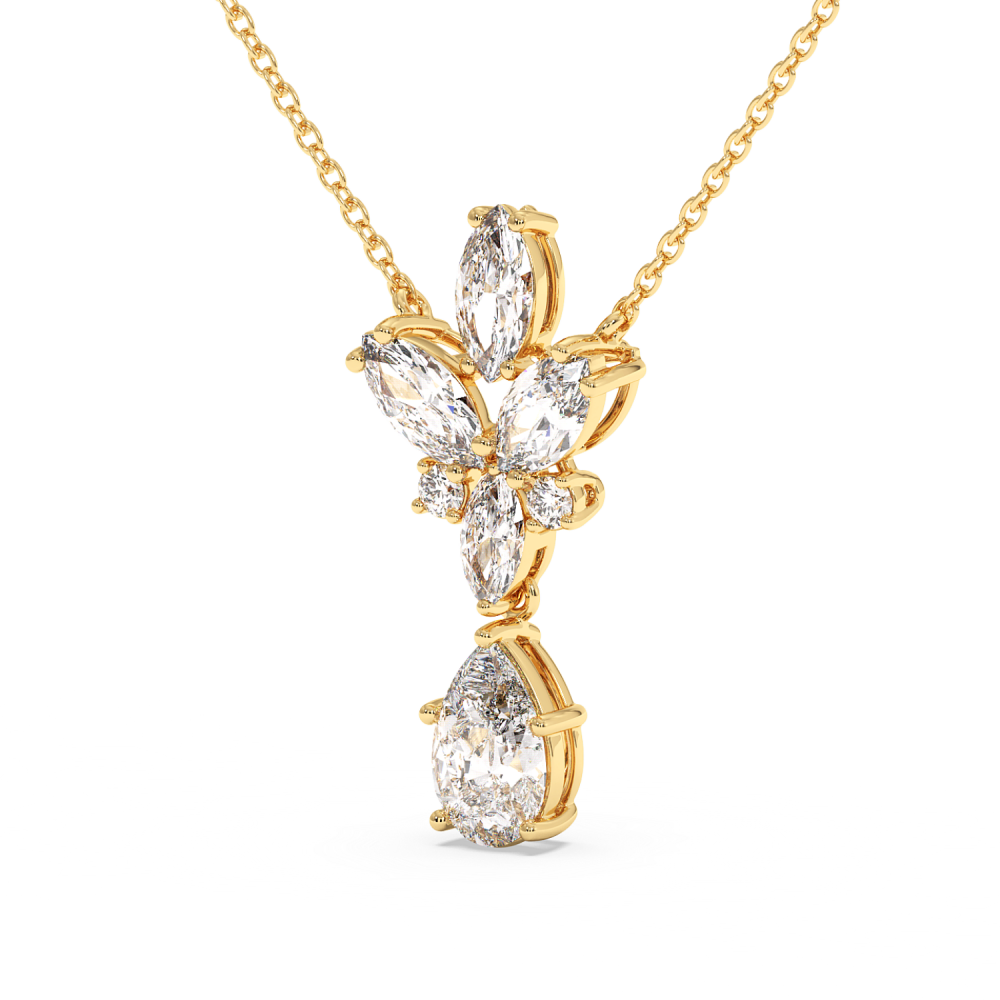 Pandantiv din aur alb de 14 K, cu diamant central pear cut de 0.81ct, diamante marquise de 1.16ct si diamante rotunde de 0.06ct. Greutatea colierului este de apx 3.5 grame. Se poate confectiona din aur alb, galben sau rose.
