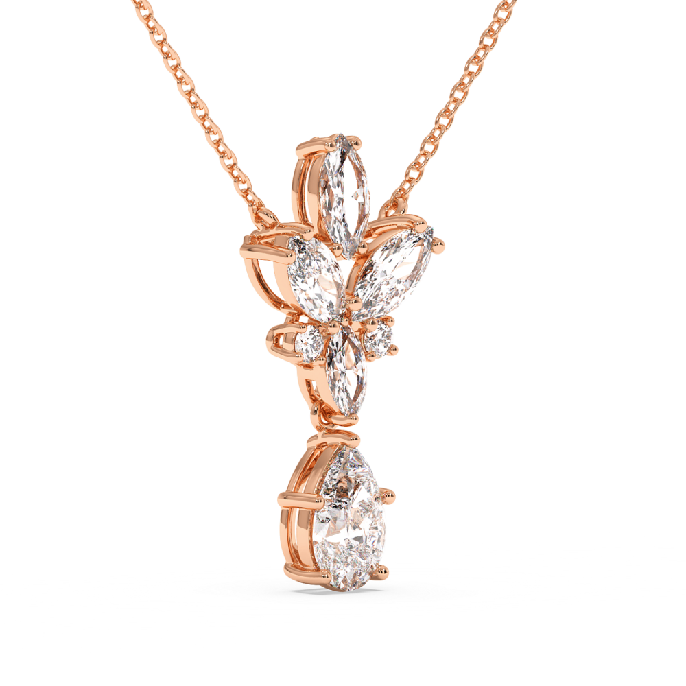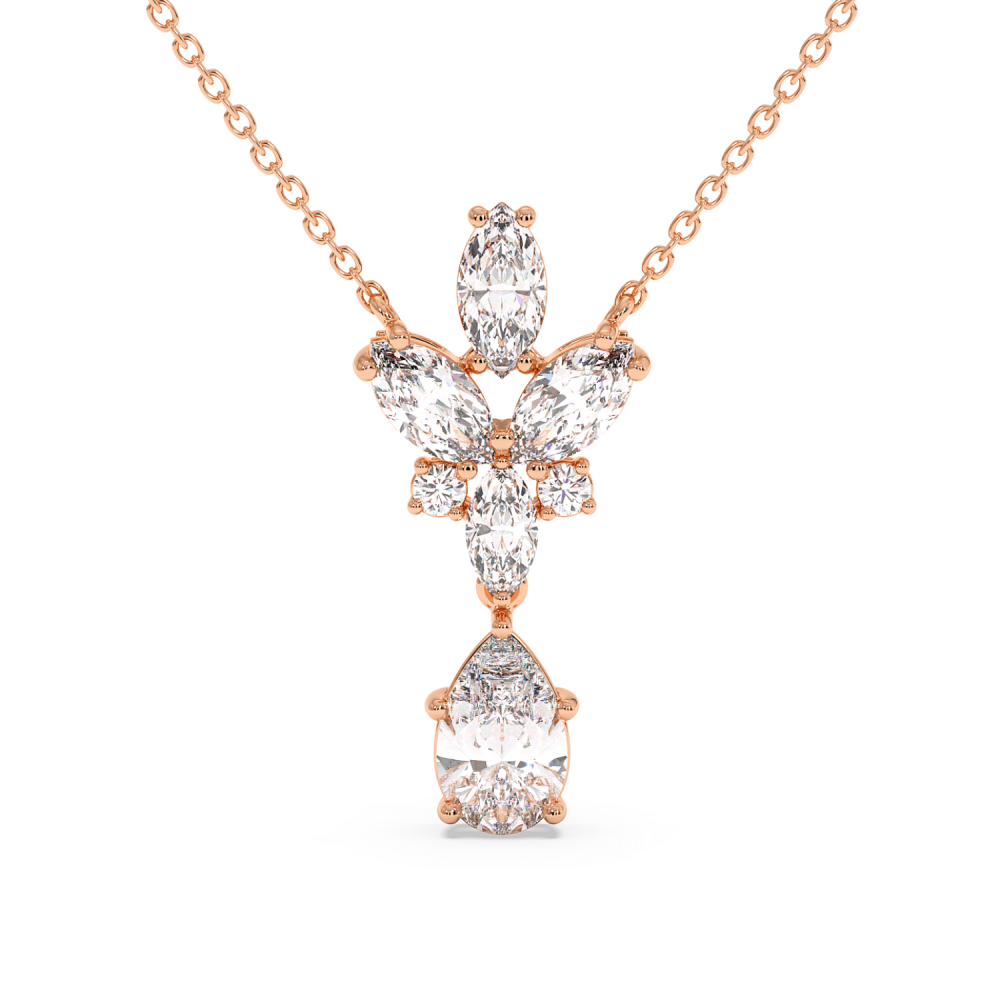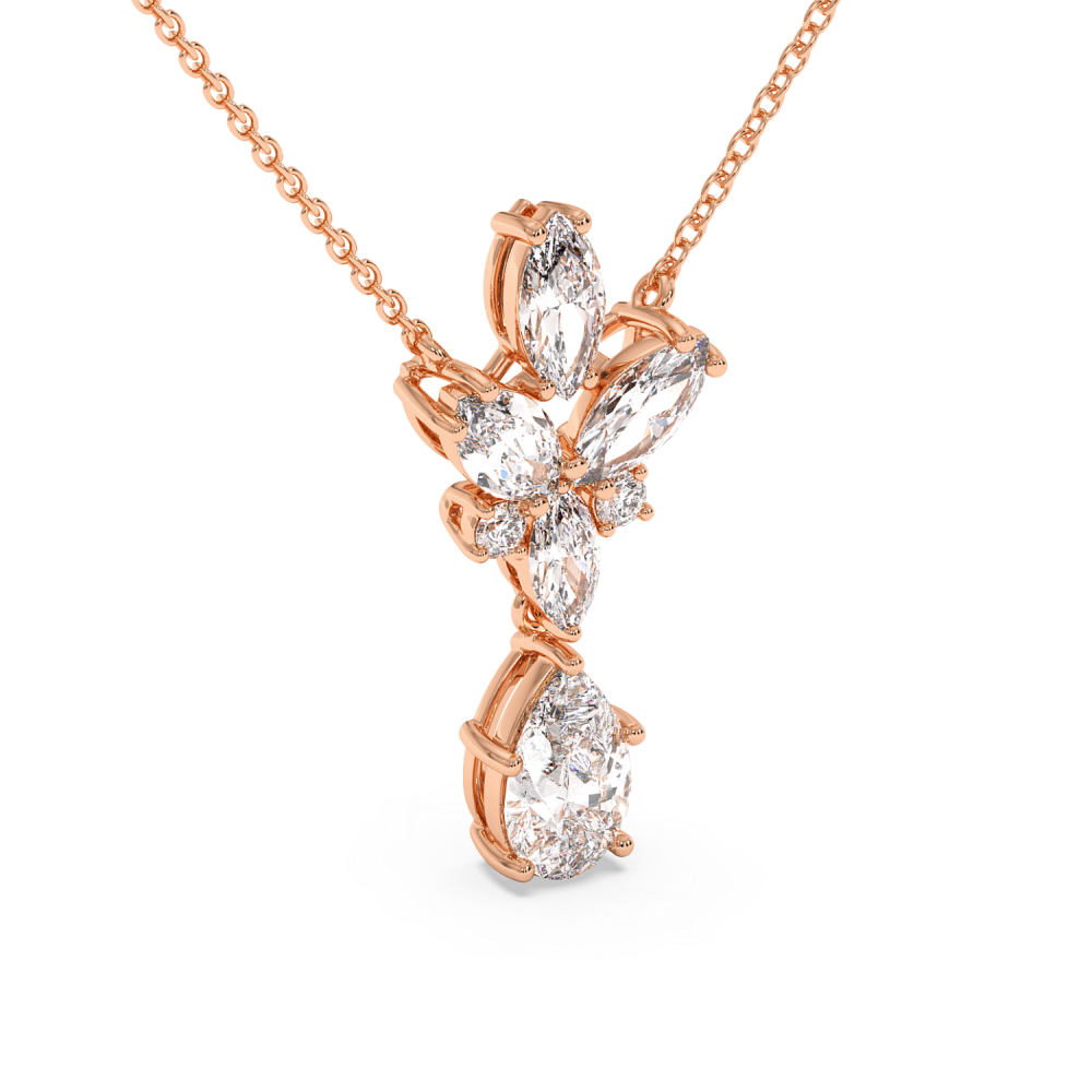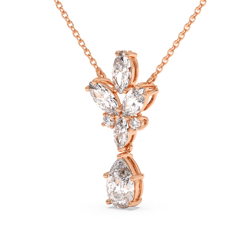 Pandantiv din aur alb de 14 K, cu diamant central pear cut de 0.81ct, diamante marquise de 1.16ct si diamante rotunde de 0.06ct. Greutatea colierului este de apx 3.5 grame. Se poate confectiona din aur alb, galben sau rose.