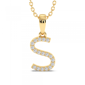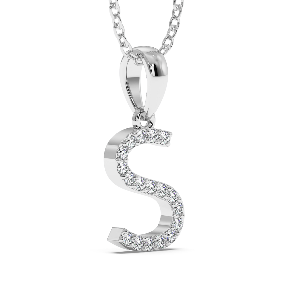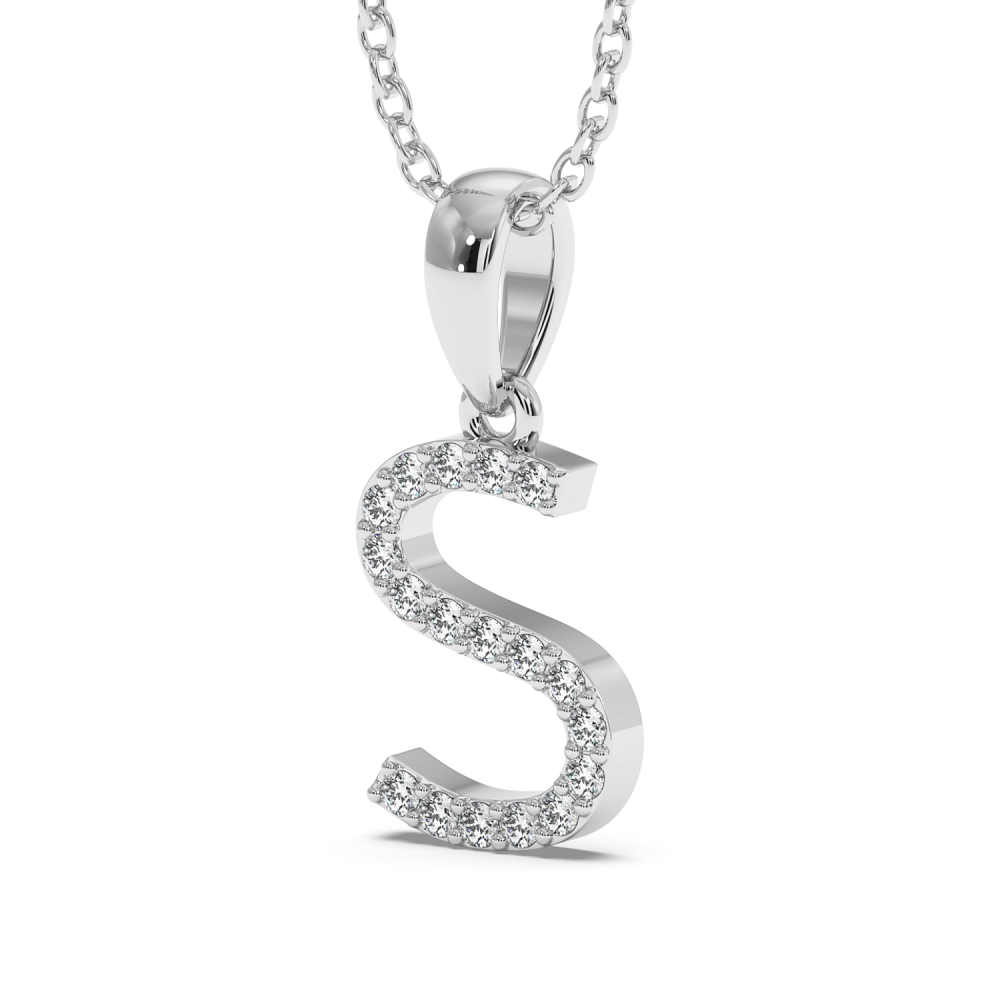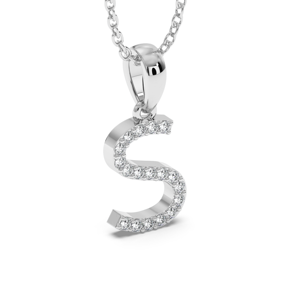 Pandantiv initiala din aur alb de 14 K, cu diamantede 0.07 ct. Greutatea pandantivului este de 1.71 grame.