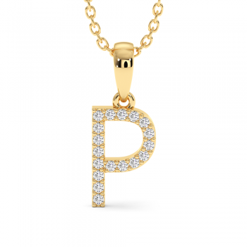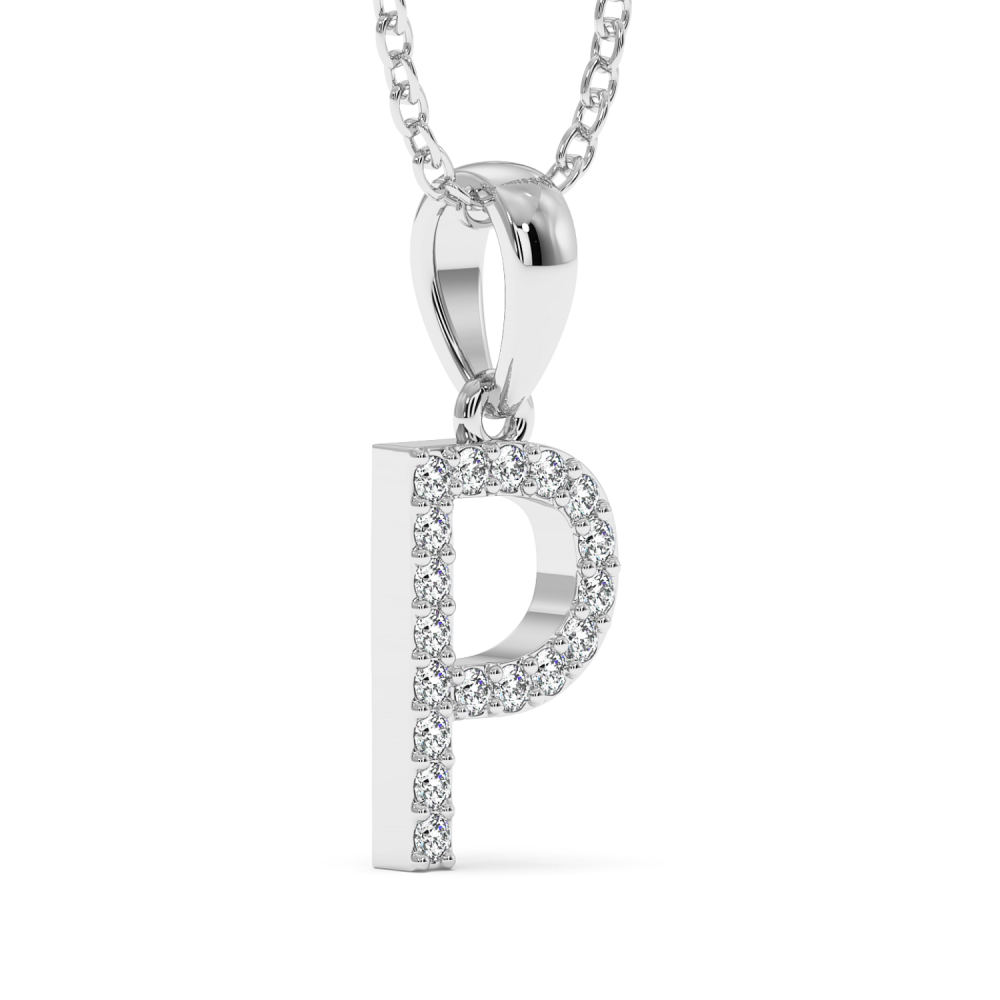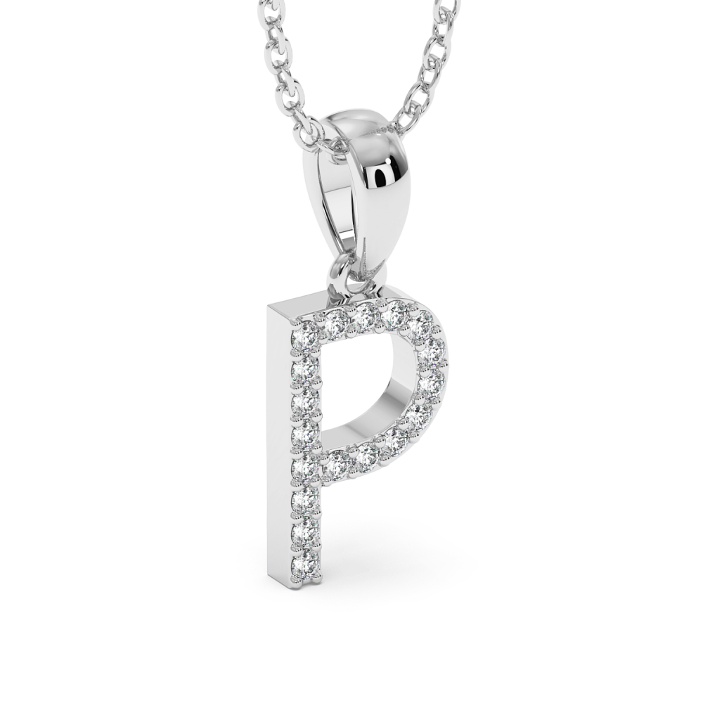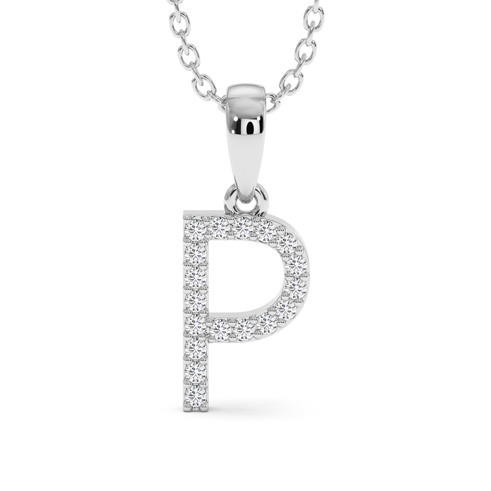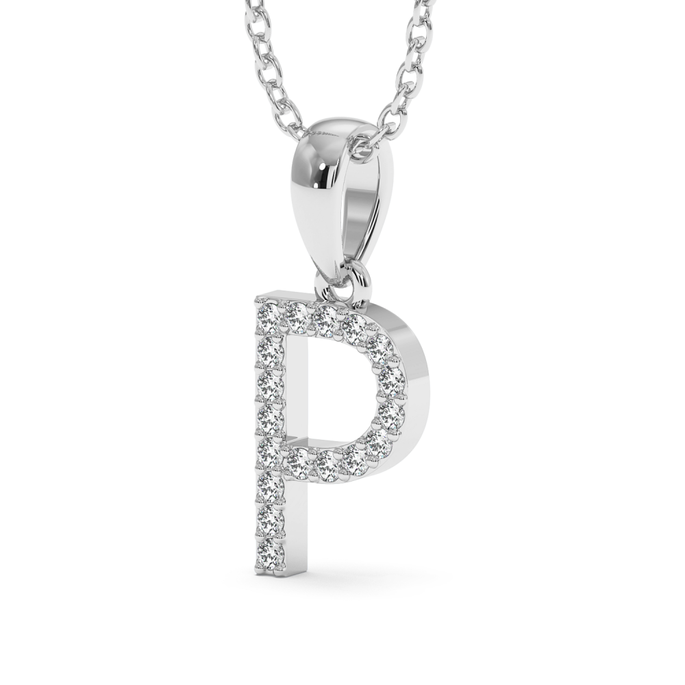 Pandantiv initiala din aur alb de 14 K, cu diamantede 0.11 ct. Greutatea pandantivului este de 2.18 grame.