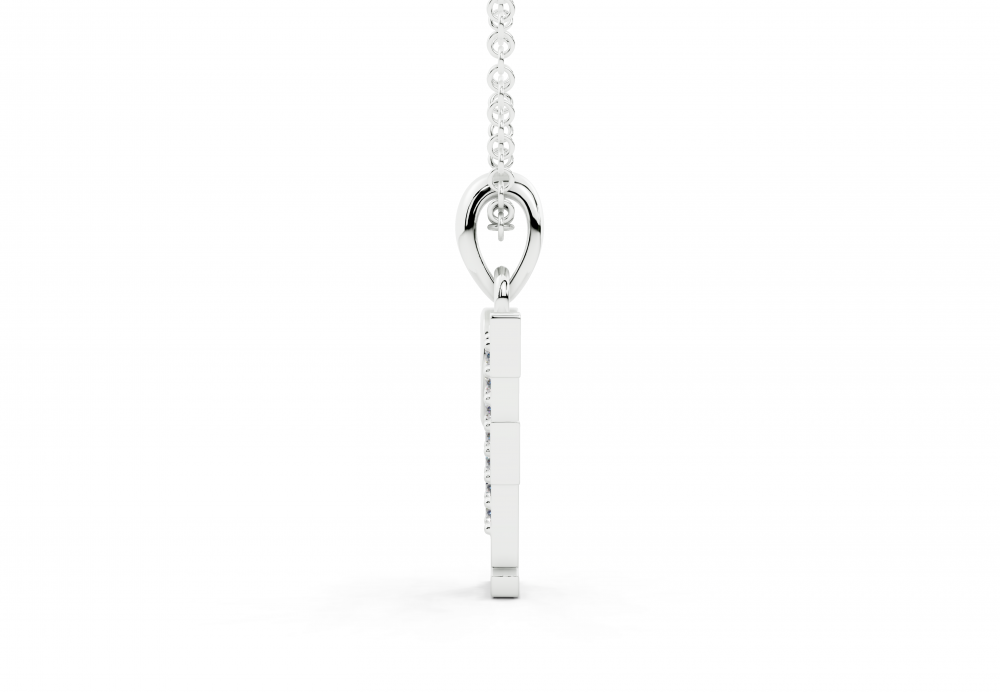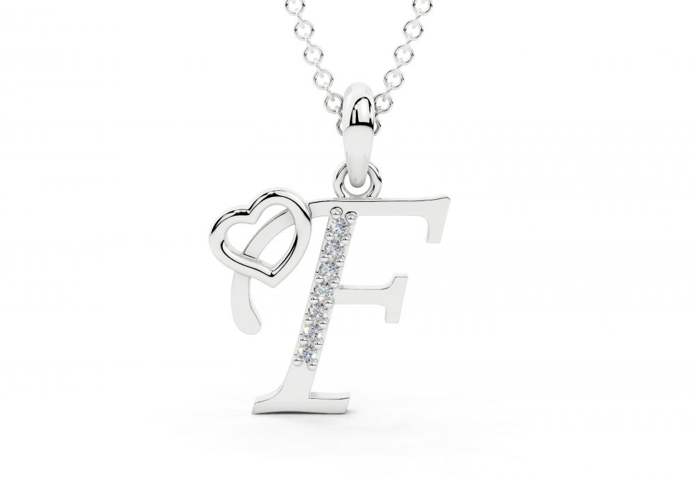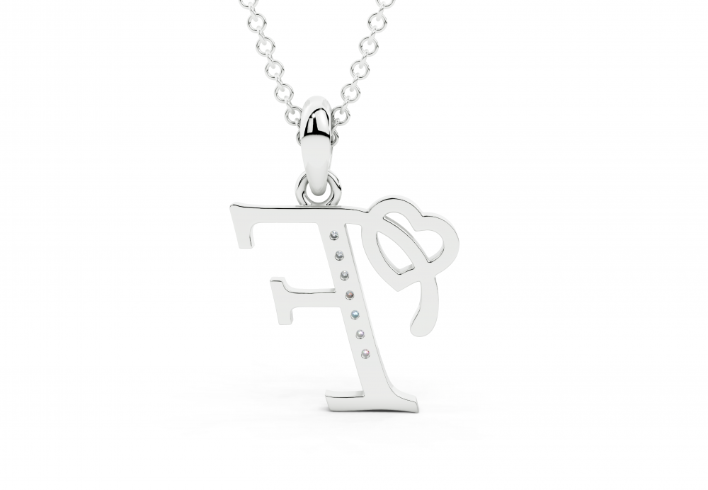 Pandantiv initiala F din aur alb de 14 K, cu diamante de 0.03ct. Greutatea aproximativa a pandantivului este de 2.50 grame.