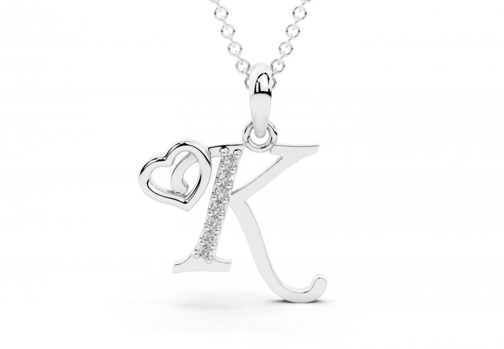 Pandantiv initiala K din aur alb de 14 K, cu diamante de 0.03ct. Greutatea aproximativa a pandantivului este de 2.70 grame.