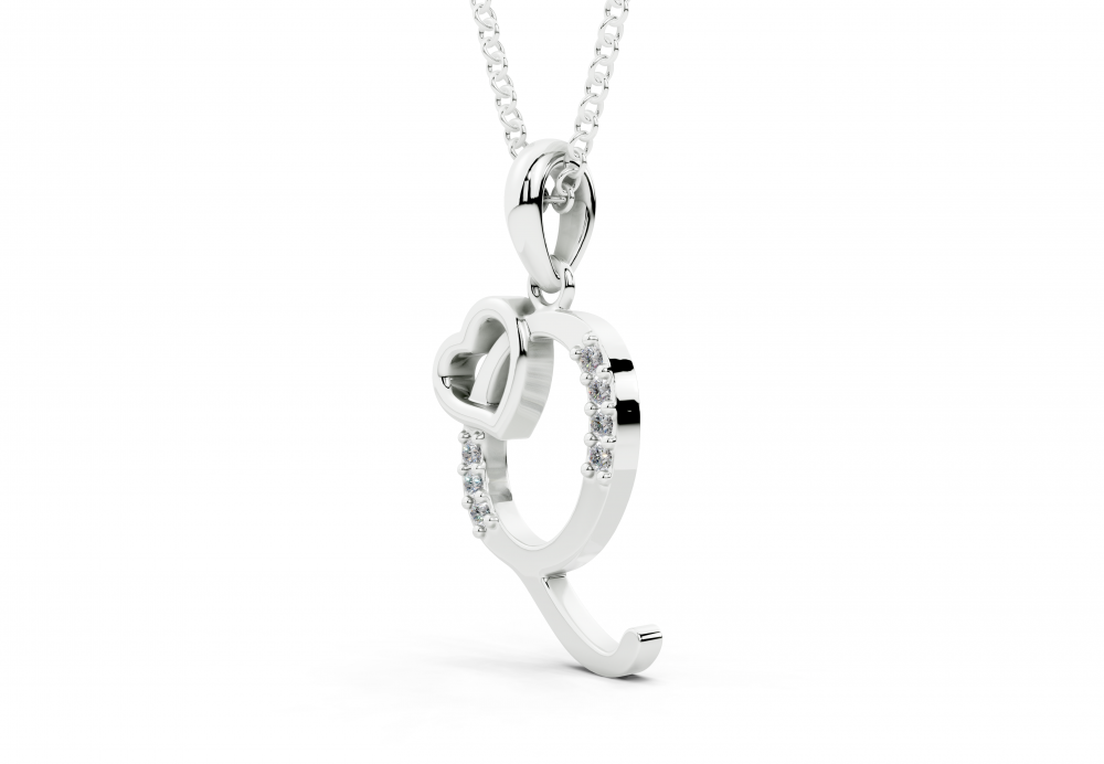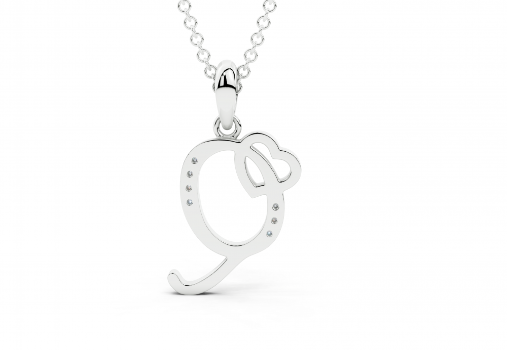Pandantiv initiala Q din aur alb de 14 K, cu diamante de 0.03ct. Greutatea aproximativa a pandantivului este de 2.70 grame.