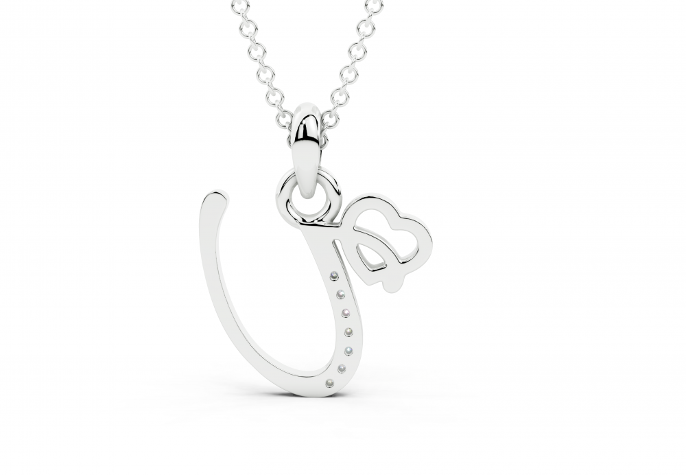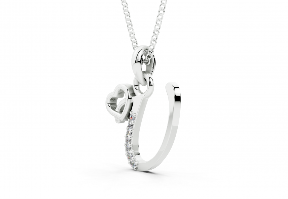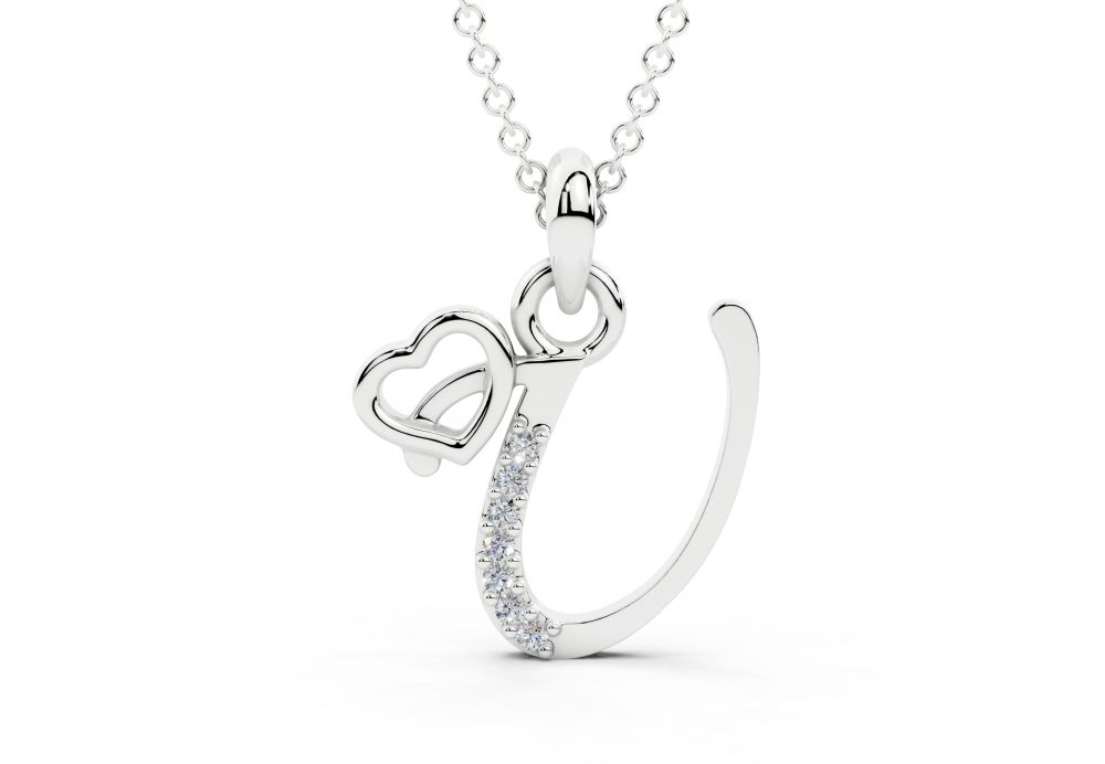 Pandantiv initiala U din aur alb de 14 K, cu diamante de 0.03ct. Greutatea aproximativa a pandantivului este de 2.70 grame.