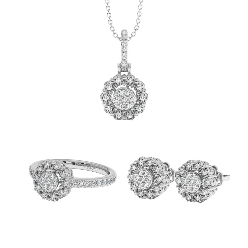 Setul cuprinde: Lant cu pandantiv din aur de 14K cu diamante de 0.24ct, cercei din aur de 14K cu diamante de 0.27ct si inel din aur de 14K cu diamante de 0.34ct. Greutatea totala a setului este de aproximativ 12.50 grame. Accesati "SPECIFICATII" pentru mai multe detalii despre acest produs.