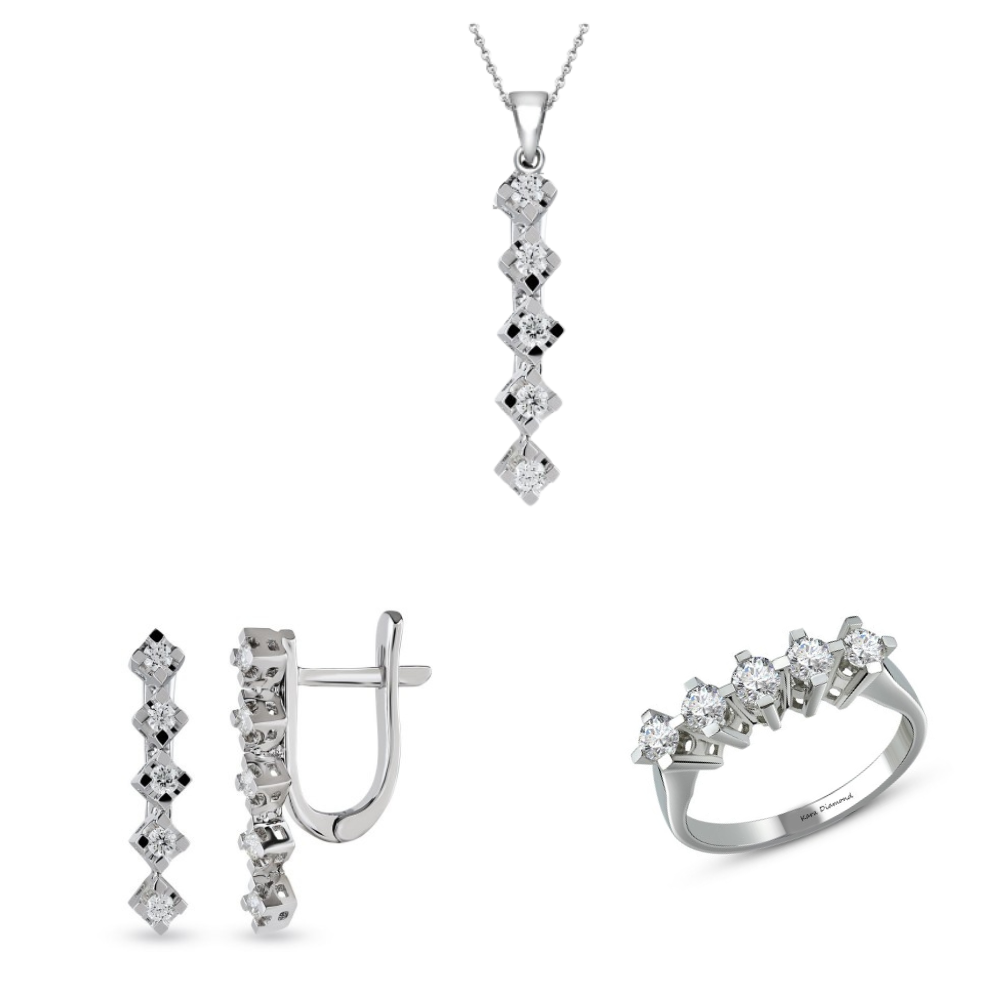 Setul cuprinde: Lant cu pandantiv ,cercei si inel din aur alb de 14K cu diamante de 1.60 ct . Greutatea totala a setului este de apx. 11.91 grame.