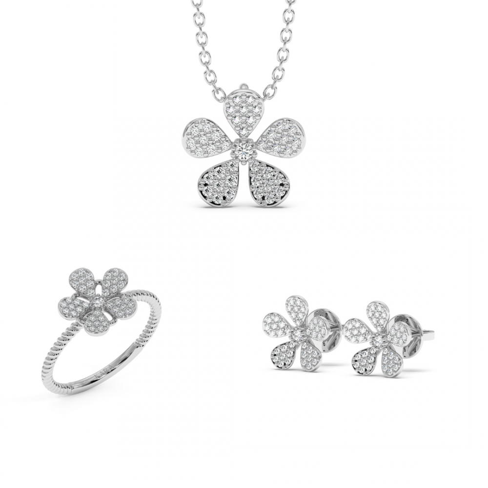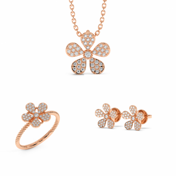 Setul cuprinde: Lant cu pandantiv , cercei si inel din aur alb de 14K cu diamante de 0.53 ct . Greutatea totala a setului este de apx 6.94 grame.