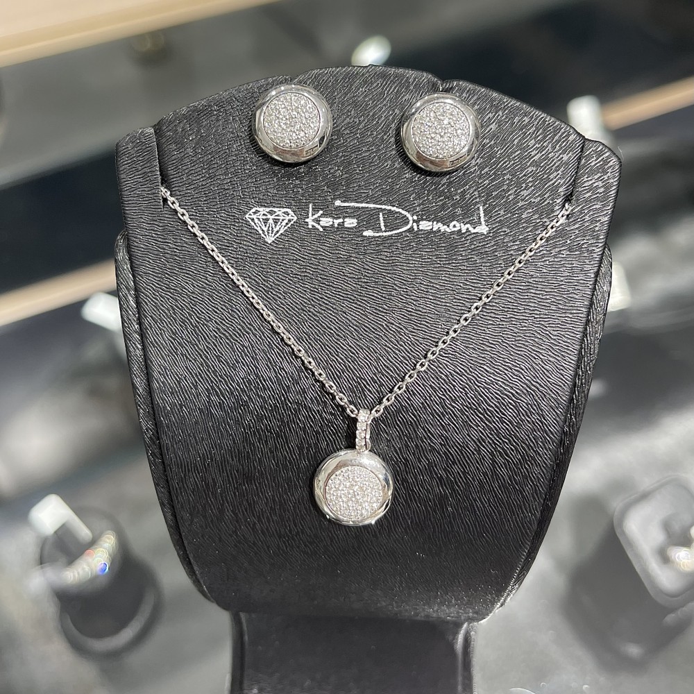 Setul cuprinde: Lant cu pandantiv si cercei din aur alb de 14K cu diamante de 0.67 ct . Greutatea totala a setului este de 9.44 grame.