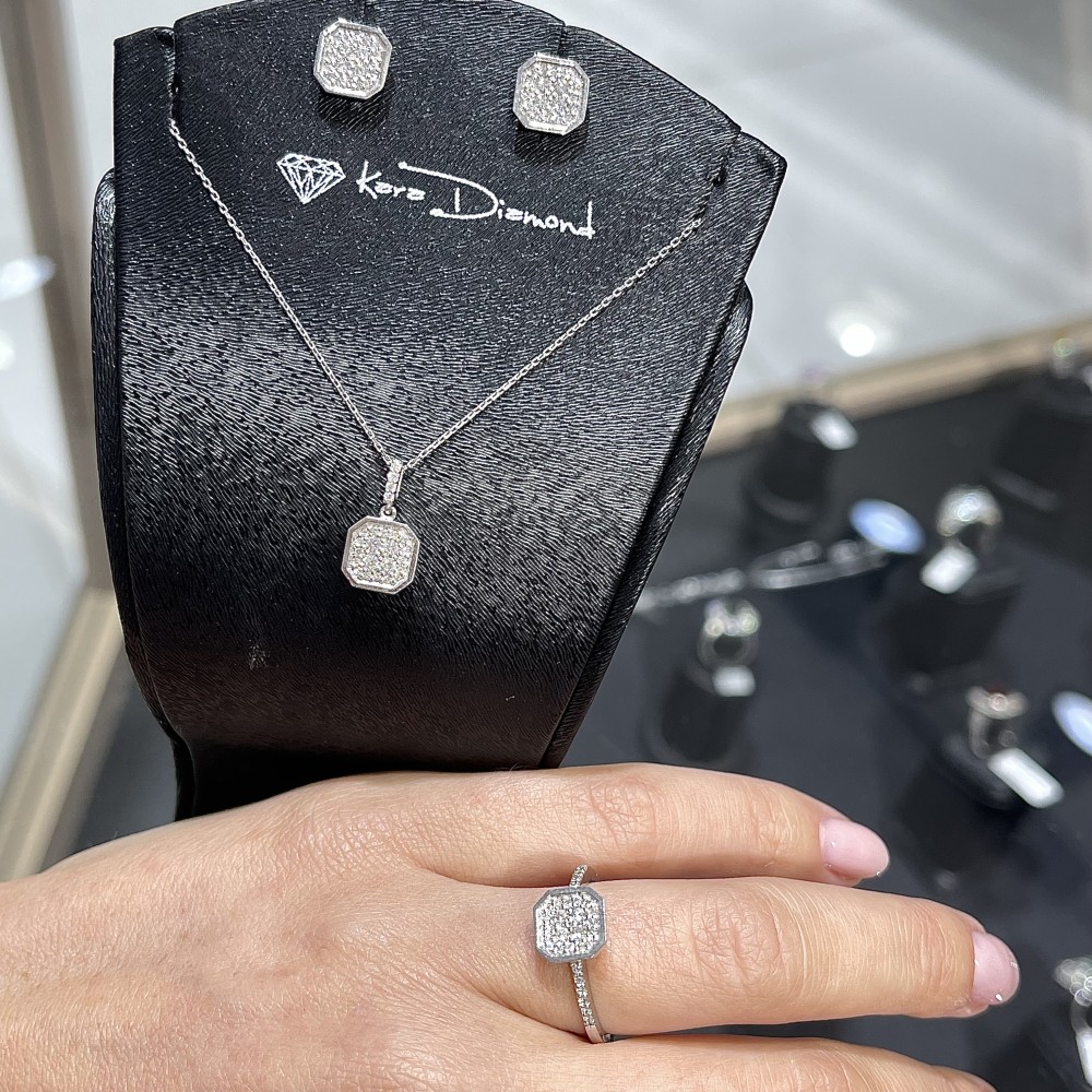 Setul cu diamante , cuprinde: Lant cu pandantiv , cercei si inel din aur alb de 14K si cu diamante de 0.71 ct . Greutatea totala a setului este de 8.60 grame.
