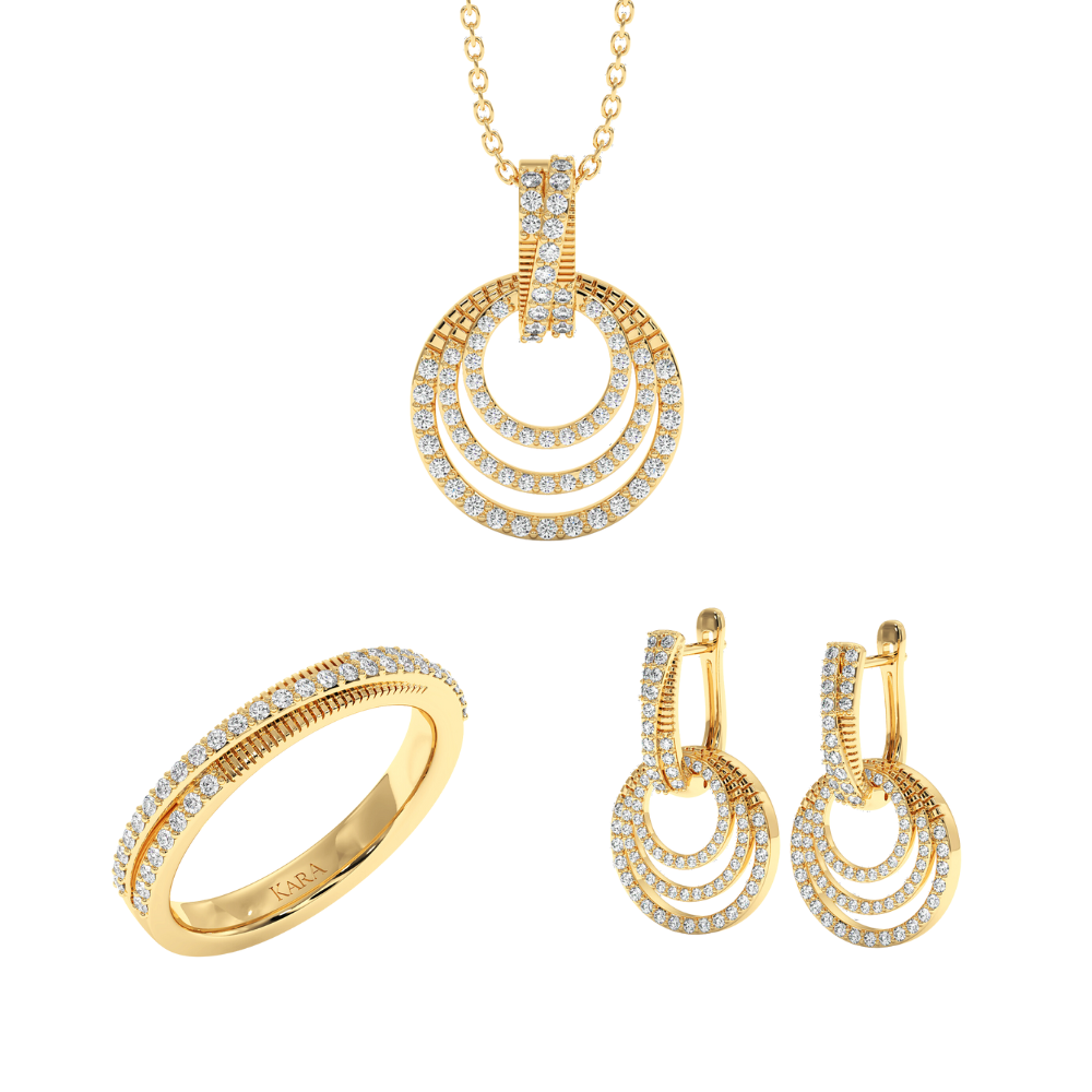 Setul cuprinde: Lant cu pandantiv din aur de 14K cu diamante de 0.35ct, cercei din aur de 14K cu diamante de 0.59ct si inel din aur de 14K cu diamante de 0.25ct. Greutatea totala a setului este de aproximativ 12.70 grame.