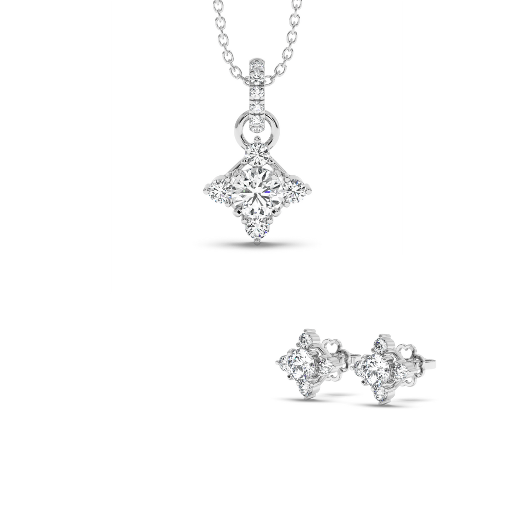 Setul  cuprinde: Lant cu pandantiv si cercei  din aur alb de 14K cu diamante de 1.20 ct . Greutatea totala a setului este de 4.87 grame.