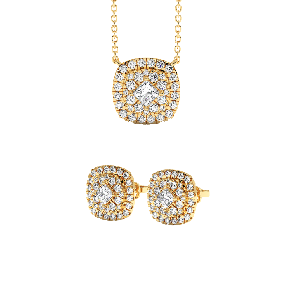 Setul cuprinde: Lant cu pandantiv din aur de 14K cu diamante de 0.61ct si cercei din aur de 14K cu diamante de 0.99ct. Greutatea totala a setului este de aproximativ 5 grame.