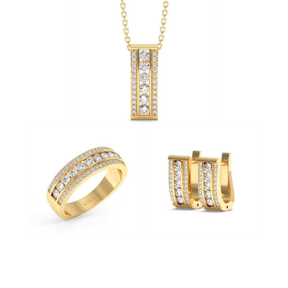 Setul cuprinde: Lant cu pandantiv, cercei si inel din aur de 14K cu diamante de 1.69ct. Greutatea totala a setului este de aproximativ 13.5 grame.