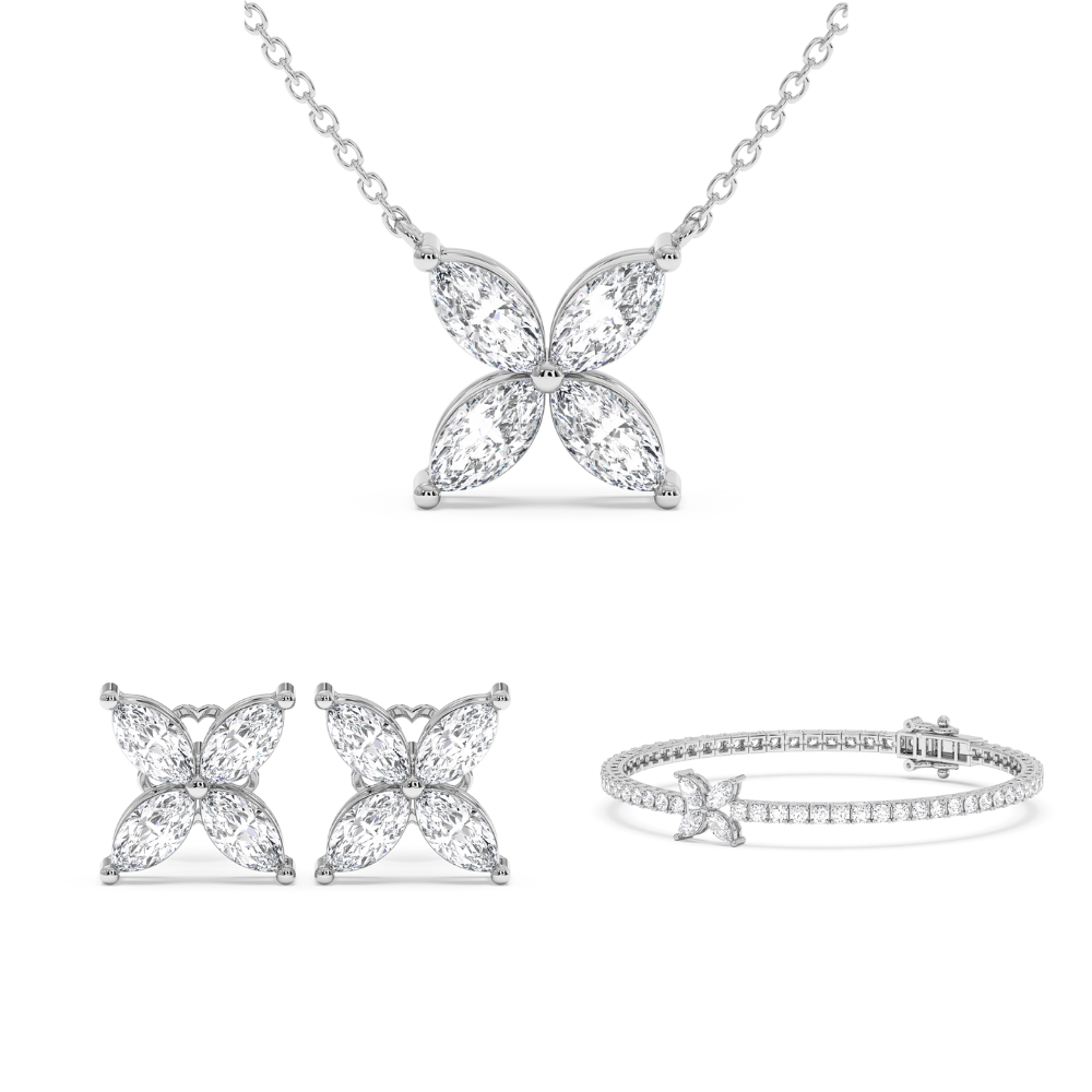 Setul cuprinde: Lant cu pandantiv din aur de 14K cu diamante marquise de 1ct, cercei din aur de 14K cu diamante marquise de 1.32ct si bratara cu diamante marquise de 0.66ct si diamante rotunde de 4.09ct. Greutatea totala a setului este de aproximativ 16 grame.