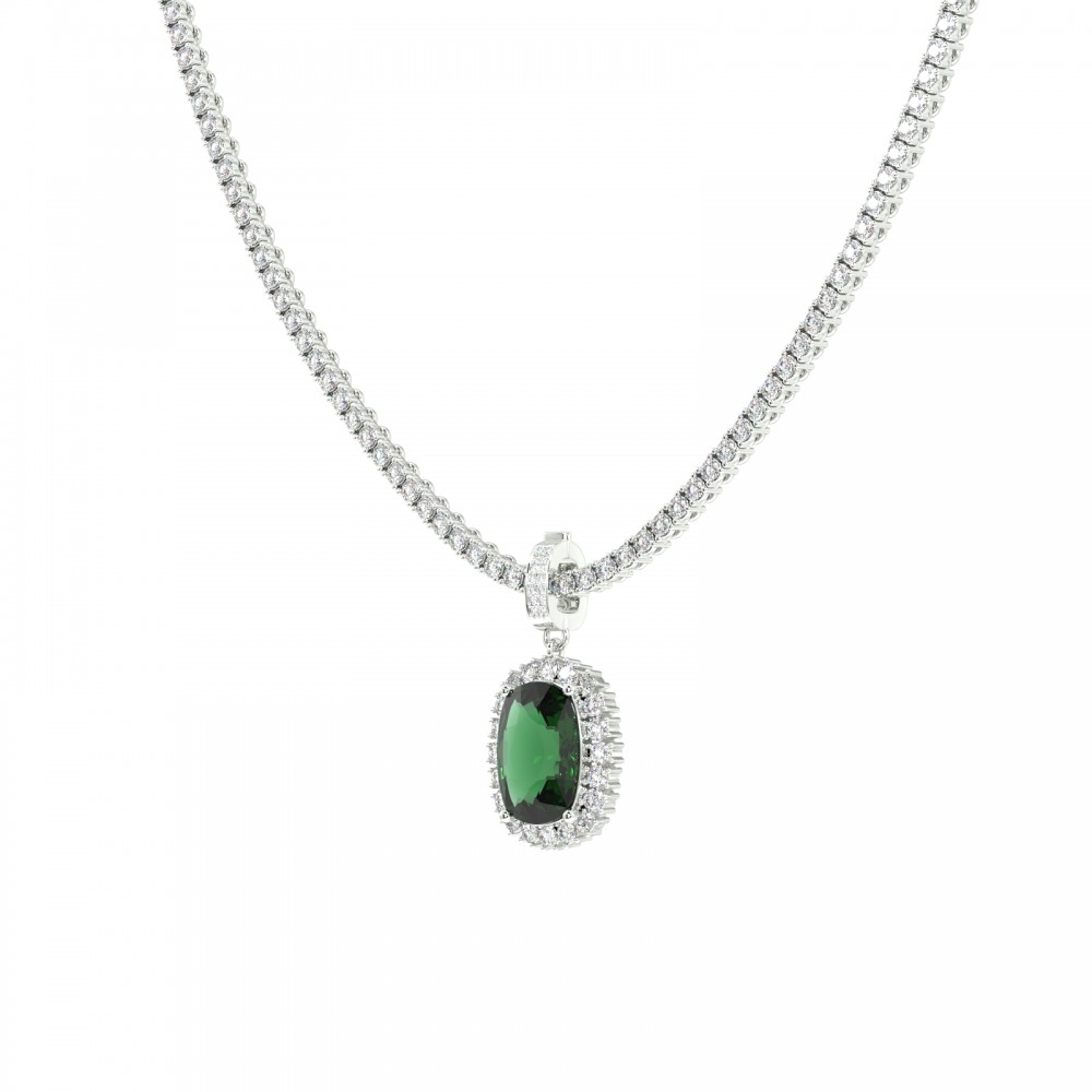 Charm pentru colierul tennis din aur alb de 14K, cu Smarald Cushion Cut de 12.08ct si diamante rotunde laterale de 1.23ct. Greutatea pandantului este de aproximativ 7.80 grame. Putem modifica design-ul in functie de bugetul dumneavoastra. Putem alege caracteristicile...