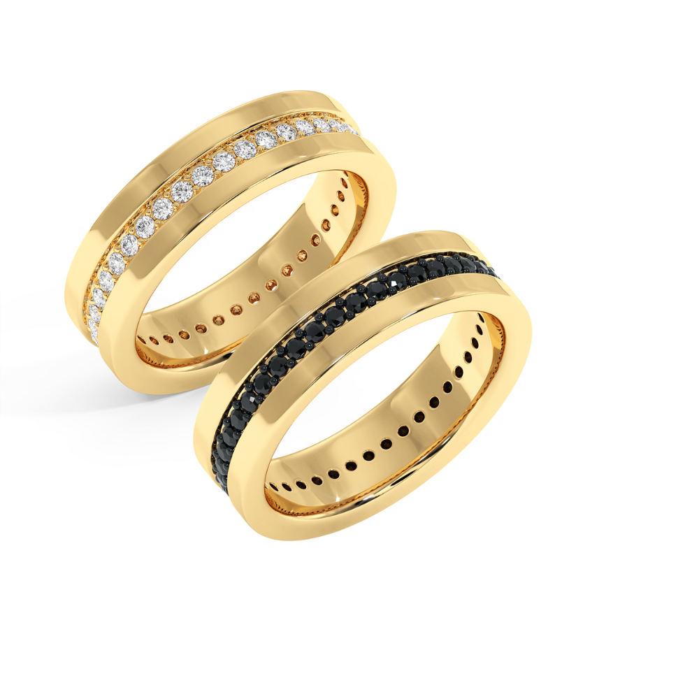 Verighete din aur de 14k cu diamante albe de 0.40ct si diamante negre de 0.70ct. Latime verigheta barbat de 6mm, latime verigheta dama de 5mm. Greutatea aproximativa este de 14.50 gr/set. Verighetele se pot face pe comanda si din aur de 18k. Putem modifica design-ul in functie de bugetul...